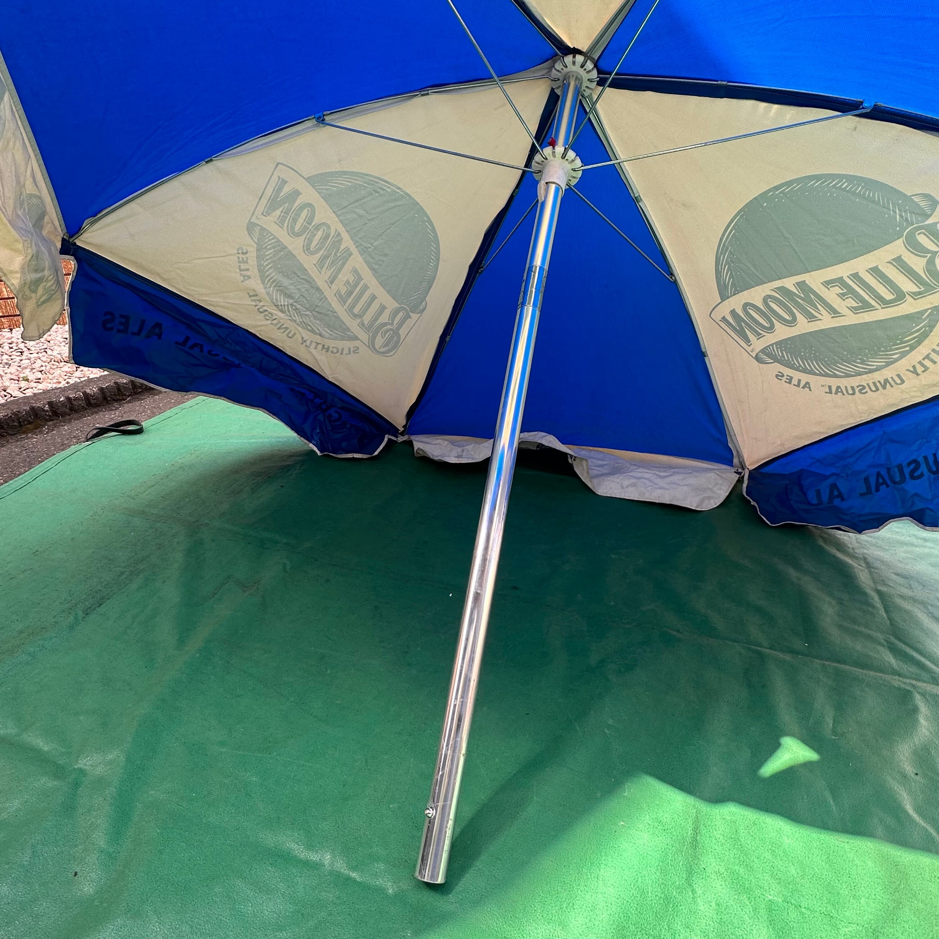 アメリカの「ミラークアーズ社」生まれのホワイトビール、ベルギースタイルとして生産されている、BLUEMOON「ブルームーン」のパラソルです。ガレージやお店のインテリアにいかがでしょうか。日本ではほとんど見かけないであろうレアアイテムです。その他のパラソルも多数出品しておりますので、お気に入りの1点をお探しください。