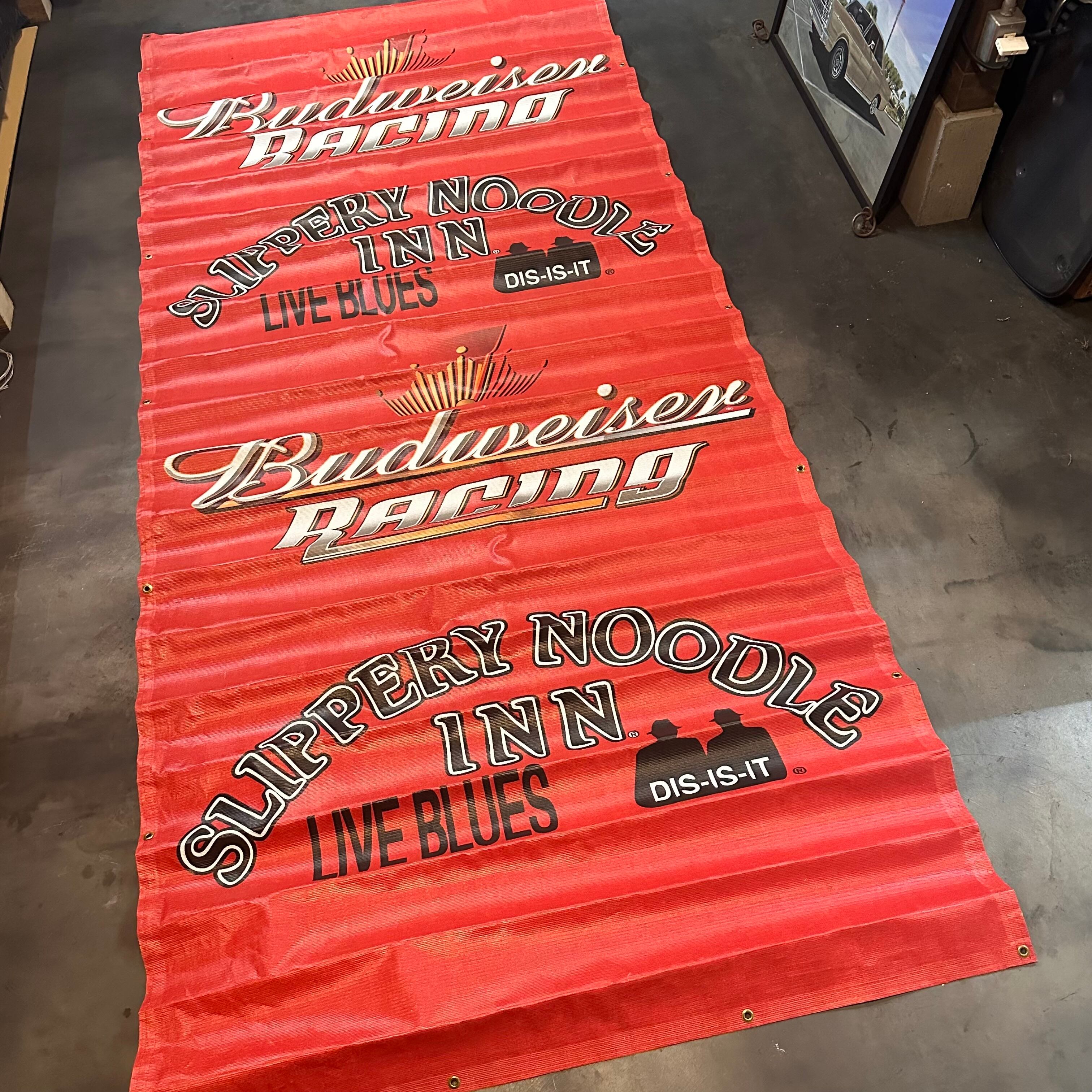 「Budweiser Racing」と、インディアナ州インディアナポリスで最も歴史あるバー『Slippery Noodlel』のデザインがドーンとプリントされた、非売品のメッシュバナーです。『Slippery Noodlel』は毎週水曜にブルースジャムセッションが開催されるバーとして有名で、きっと販促用に作られた貴重なアイテムです。