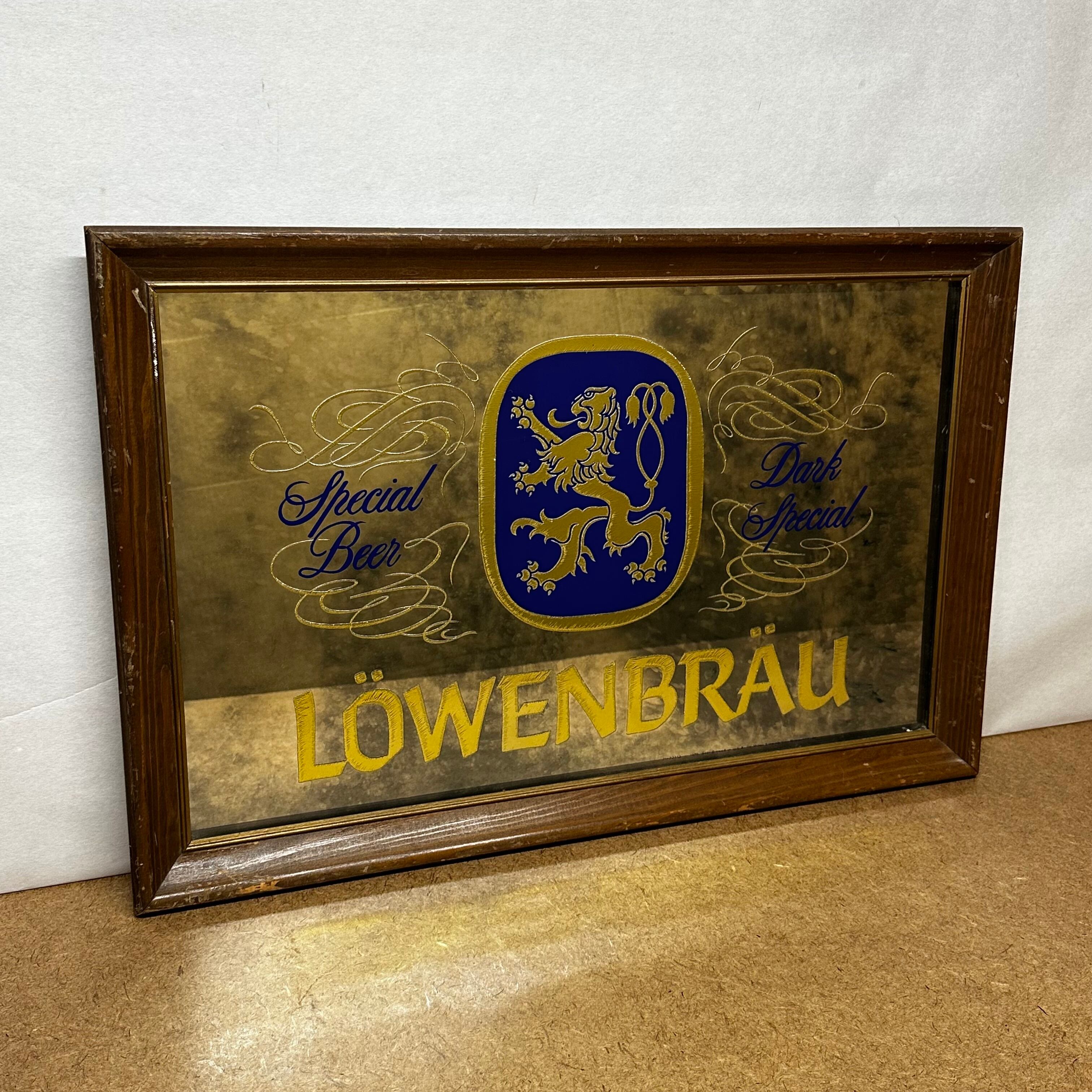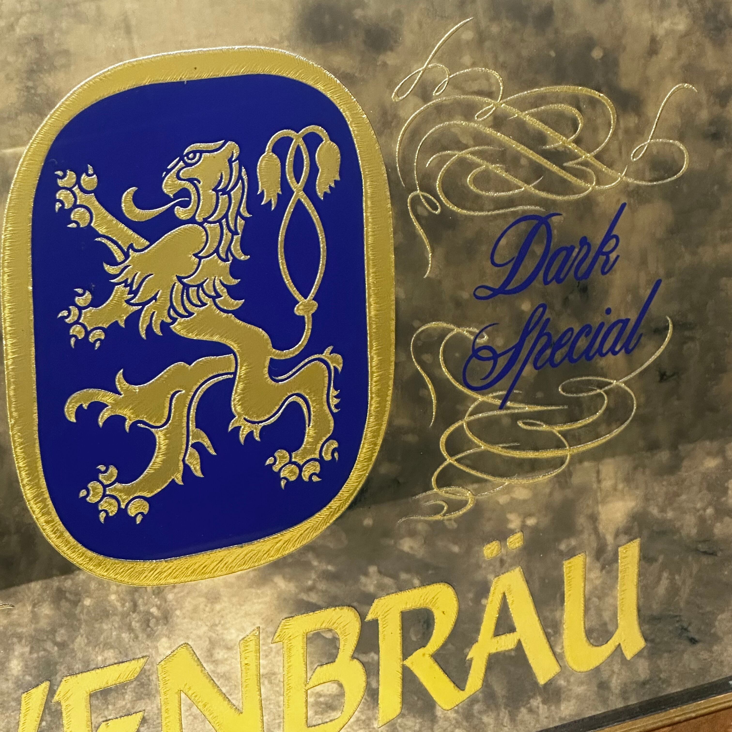 ご紹介するのは、ドイツの老舗ビールメーカー「LOWENBRAU(レーベンブロイ)」のヴィンテージパブミラーです。このミラーは、アメリカで買い付けられたもので、1980年代頃の製造と推測されます。ミュンヘンのレーベンブロイ社は1383年頃からビールを製造しており、現在もドイツで販売されている非常に歴史の長い名の知られたビール会社です。