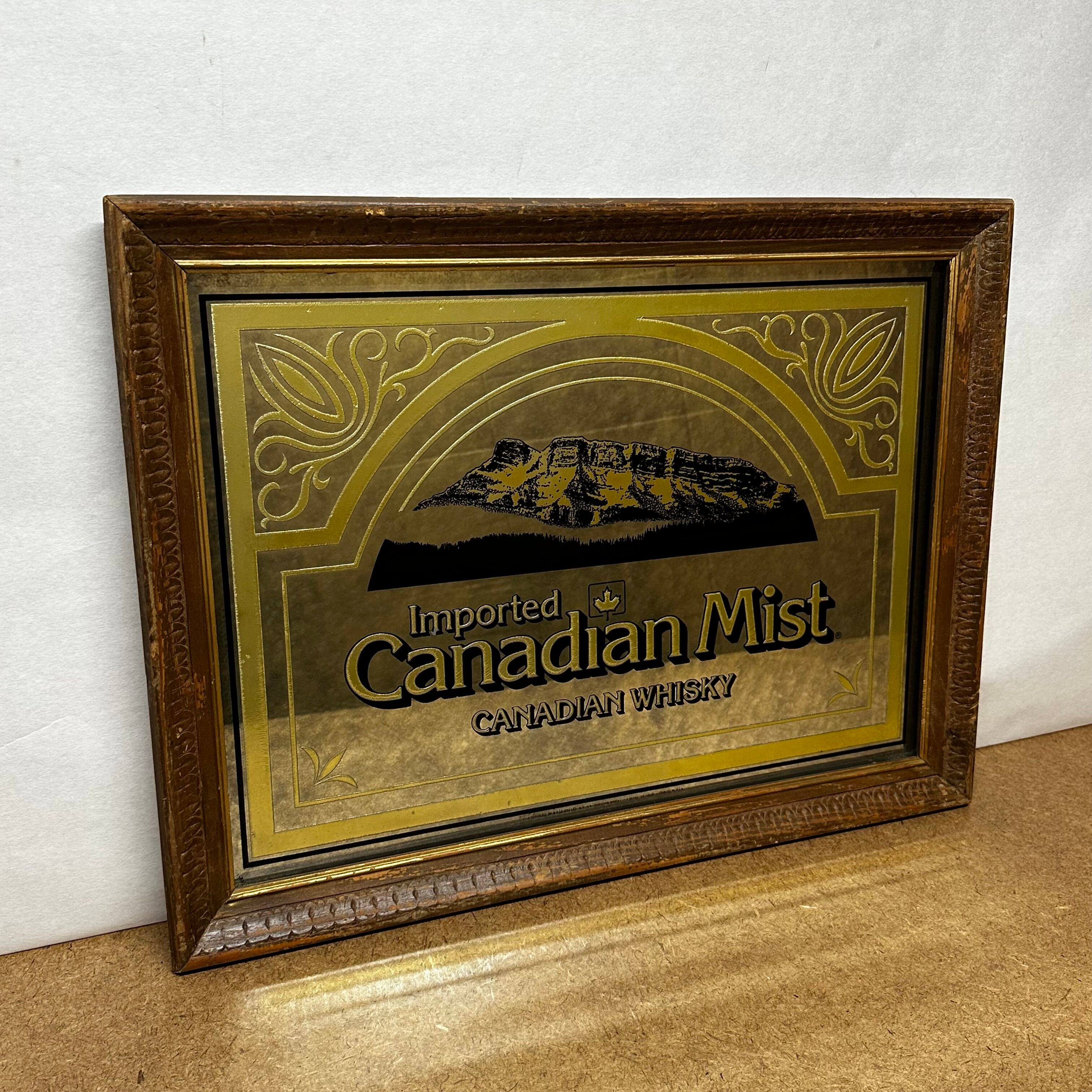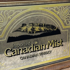 カナダ生まれの人気ウイスキー「Canadian Mist(カナディアンミスト)」のヴィンテージパブミラーです。1967年、オンタリオ州コリンクウッドに誕生したカナディアンミスト蒸留所から生み出された名品。アメリカの禁酒法時代を越え、60年代に再び訪れたウイスキーブームの波に乗り、一躍ベストセラーとなったブランドの歴史を感じられる一点です。