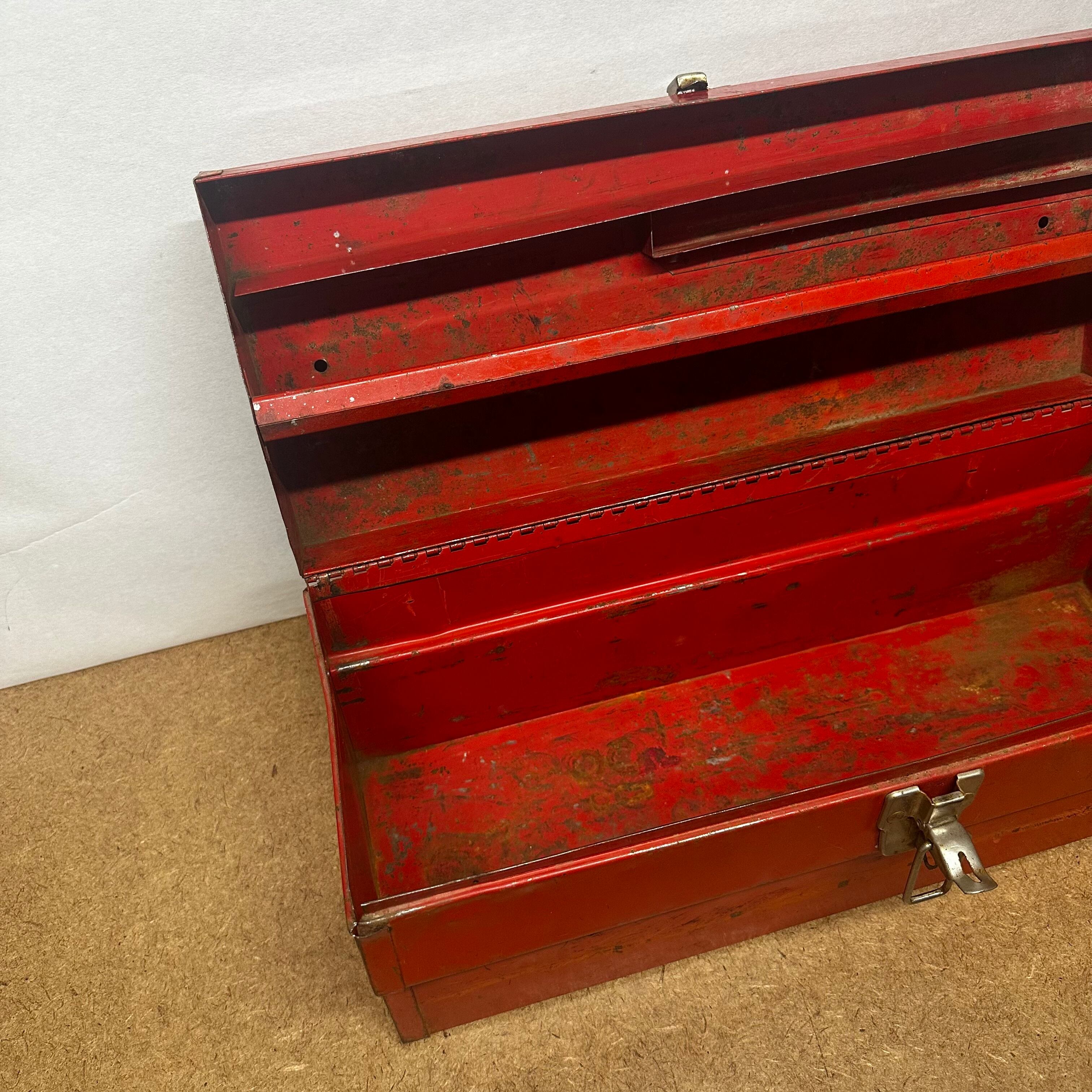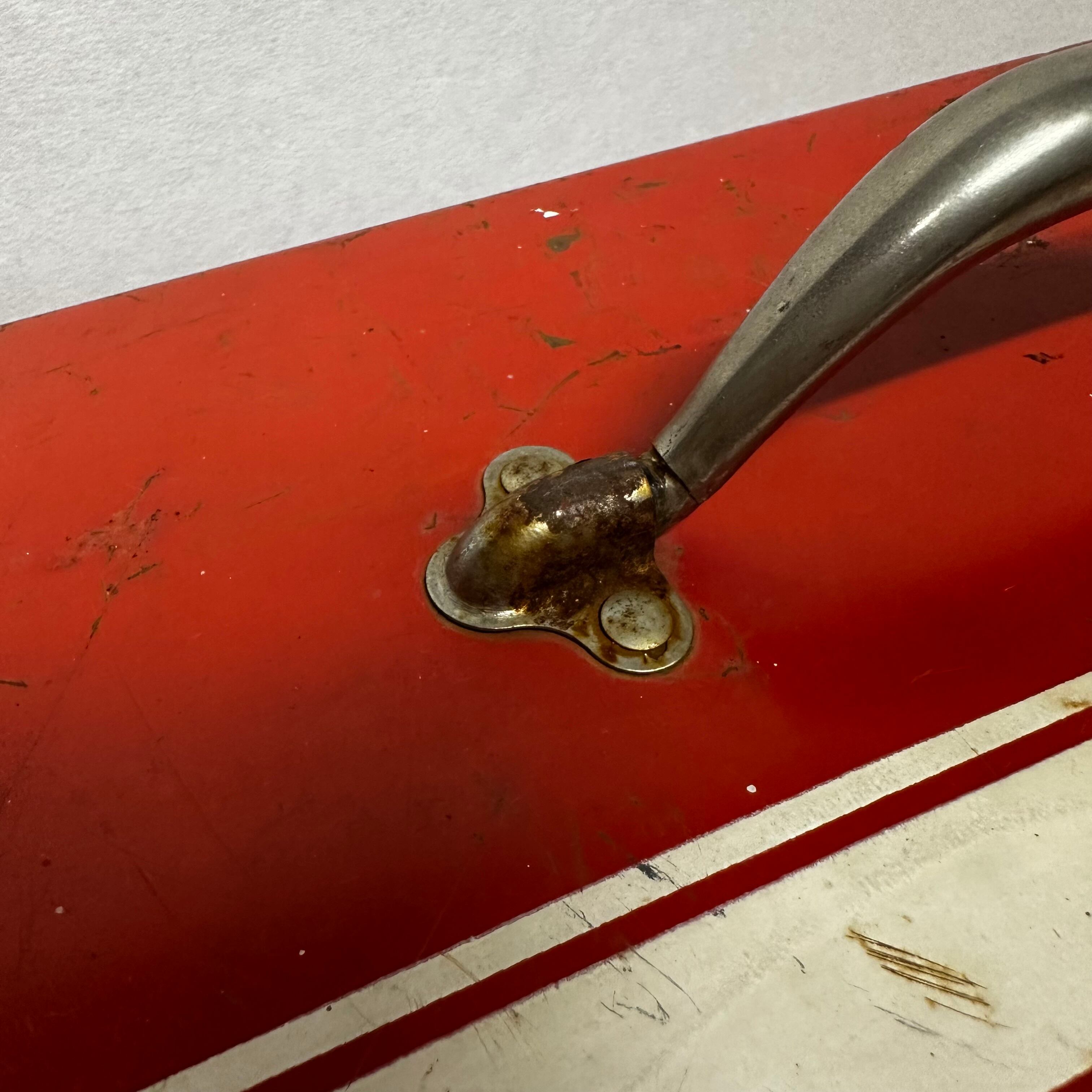 蓋の開閉や持ち手の稼働も良好で、ビンテージならではの小さなキズやサビは味わいとして楽しめる状態です。アウトドアでの実用はもちろん、ガレージやお部屋のアクセントとしても赤いカラーが映えるアイテムです。