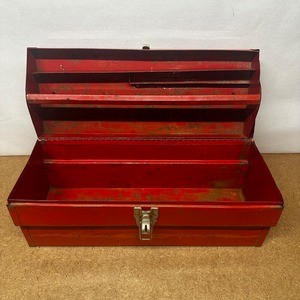 鮮やかなレッドが目を引く、アメリカンヴィンテージのツールボックスです。年代は不明ですが、アメリカのカーレース文化にちなんで作られたのアイテムではないかと考えられます。全面や背面に企業ロゴや生産社の表記はなく、シンプルで飽きのこないデザインが魅力です。中身には工具は入っておらず、インテリアやディスプレイ、収納ボックスとしてもお使いいただけます。