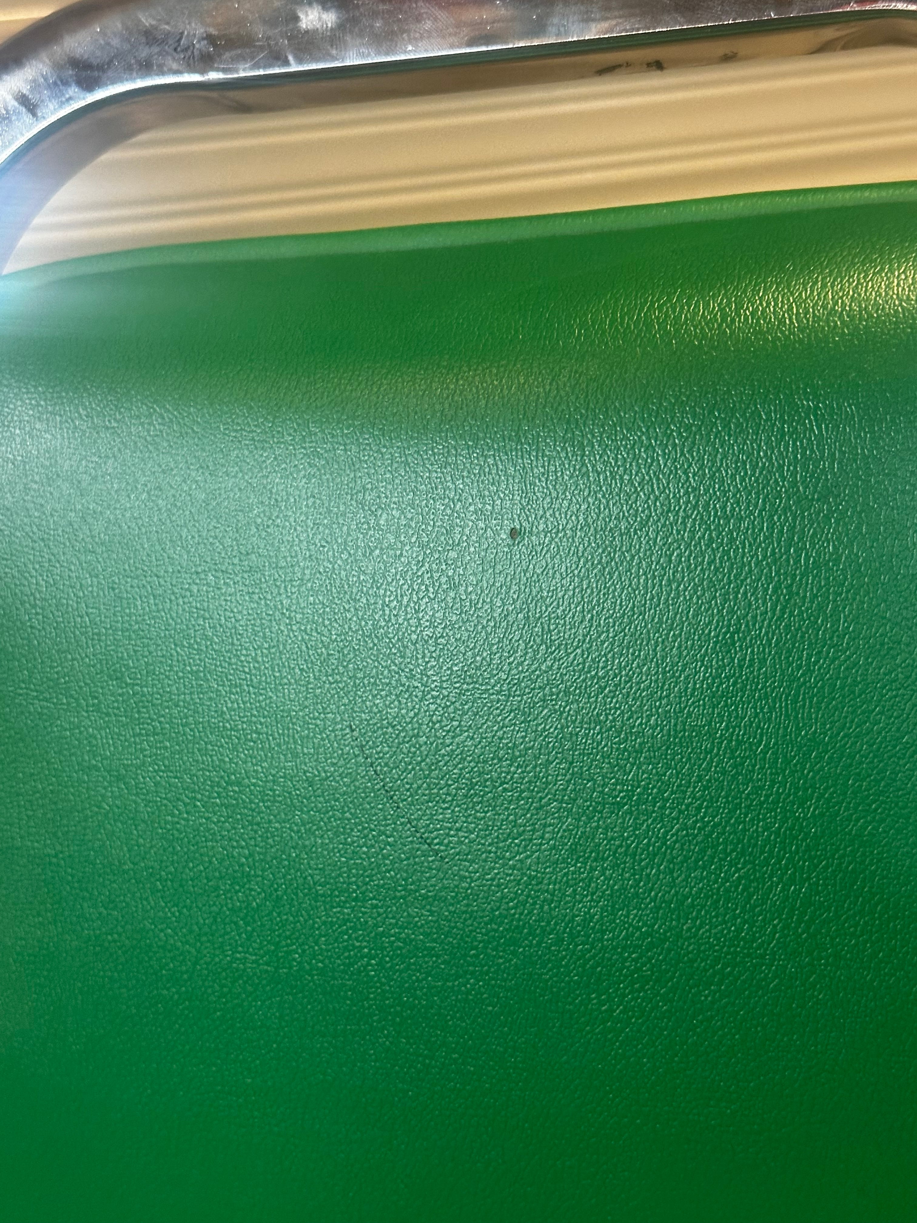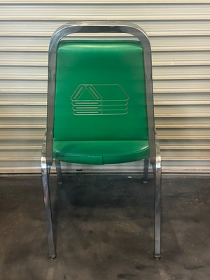 ・素材とデザイン: クロームメッキのフレームと鮮やかなグリーンのビニールレザー(または合成皮革)の座面・背もたれが特徴です。業務用または店舗用としてデザインされた、耐久性のある構造だと思われます。