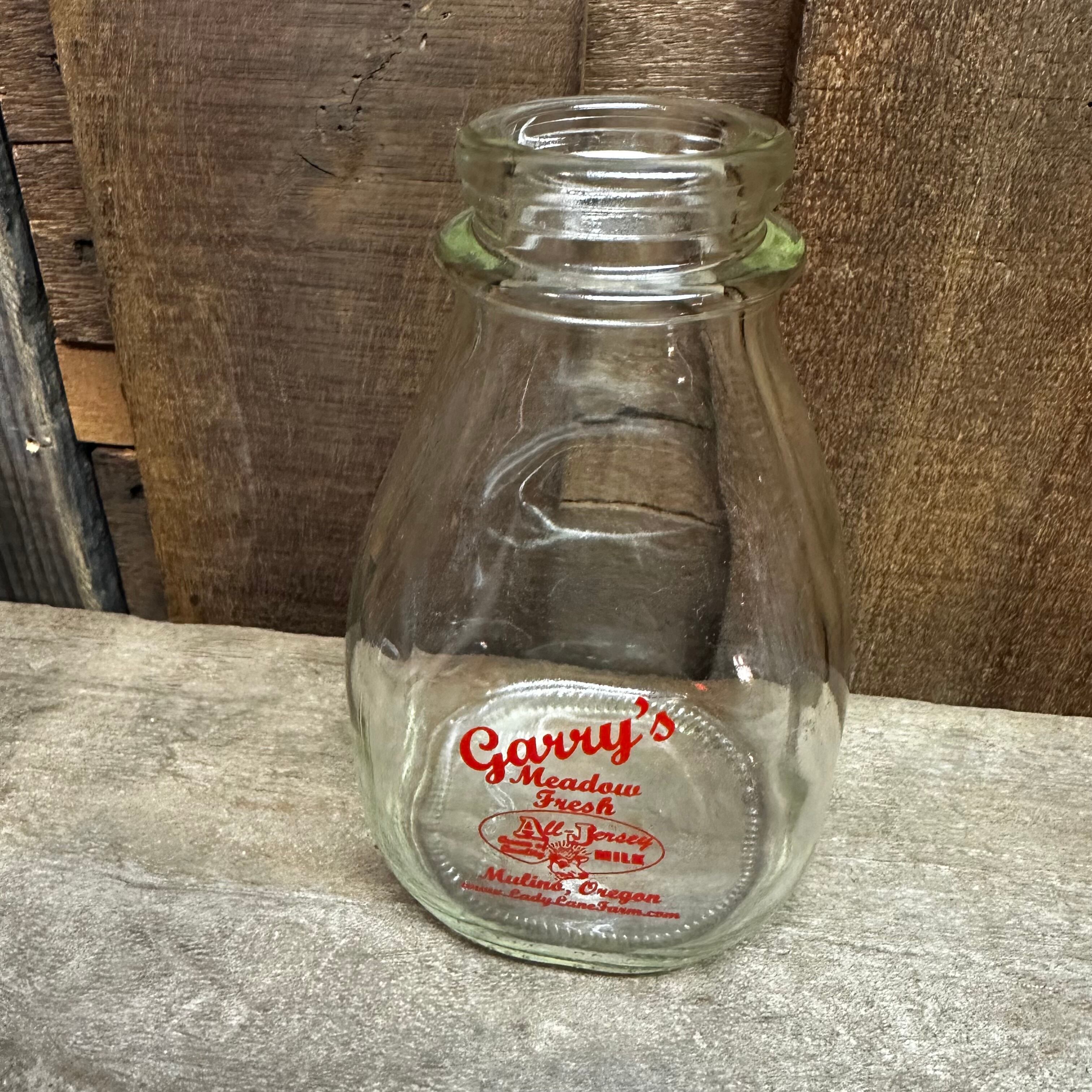 こちらのガラス製ミルク瓶は、オレゴン州マリノにある「Lady Lane Farm(レディ・レーン・ファーム)」の「Garry's Meadow Fresh(ギャリーズ・メドウ・フレッシュ)All-Jersey Milk」のものです。瓶のデザインには、赤い文字でブランド名や生産地(Mulino, Oregon)、そしてウェブサイトアドレス(www.LadyLaneFarm.com)が印字されており、素朴ながらも魅力的なアクセントとなっています。