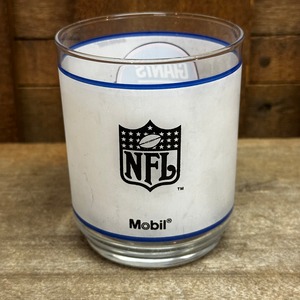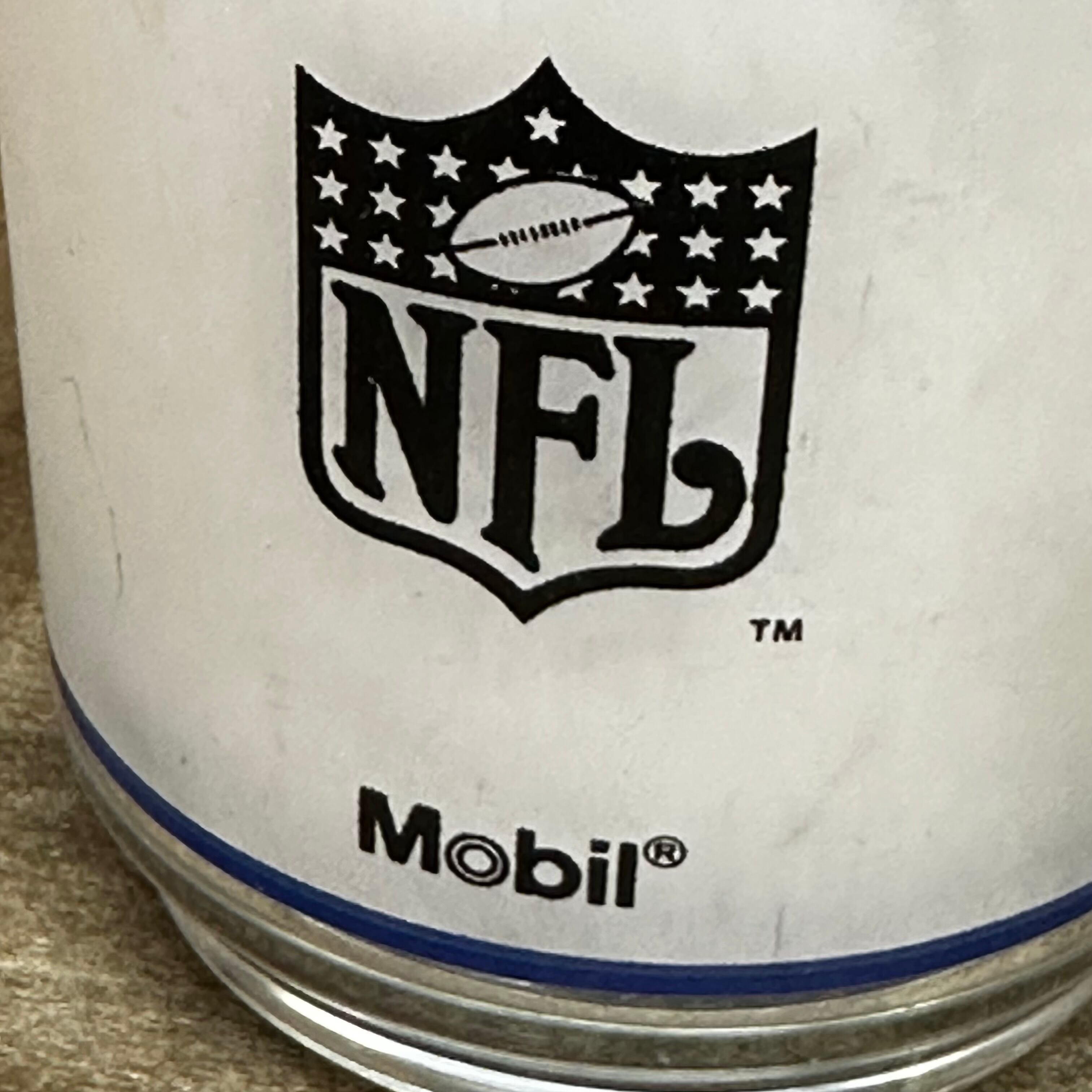 NFLの人気チーム「ニューヨーク・ジャイアンツ」のヘルメットロゴがデザインされた、貴重なヴィンテージグラスです。チームカラーである青が鮮やかに彩られたヘルメットロゴが目を引きます。ガラスの質感と、レトロなデザインが魅力的な逸品。フットボールファンの方や、ヴィンテージアイテムがお好きな方にはたまらないコレクションアイテムとなること間違いなしです。おそらく1980年代後半から1990年代初頭にかけて、モービル(Mobil)のガソリンスタンドでプロモーション品として配布されたものと考えられます。