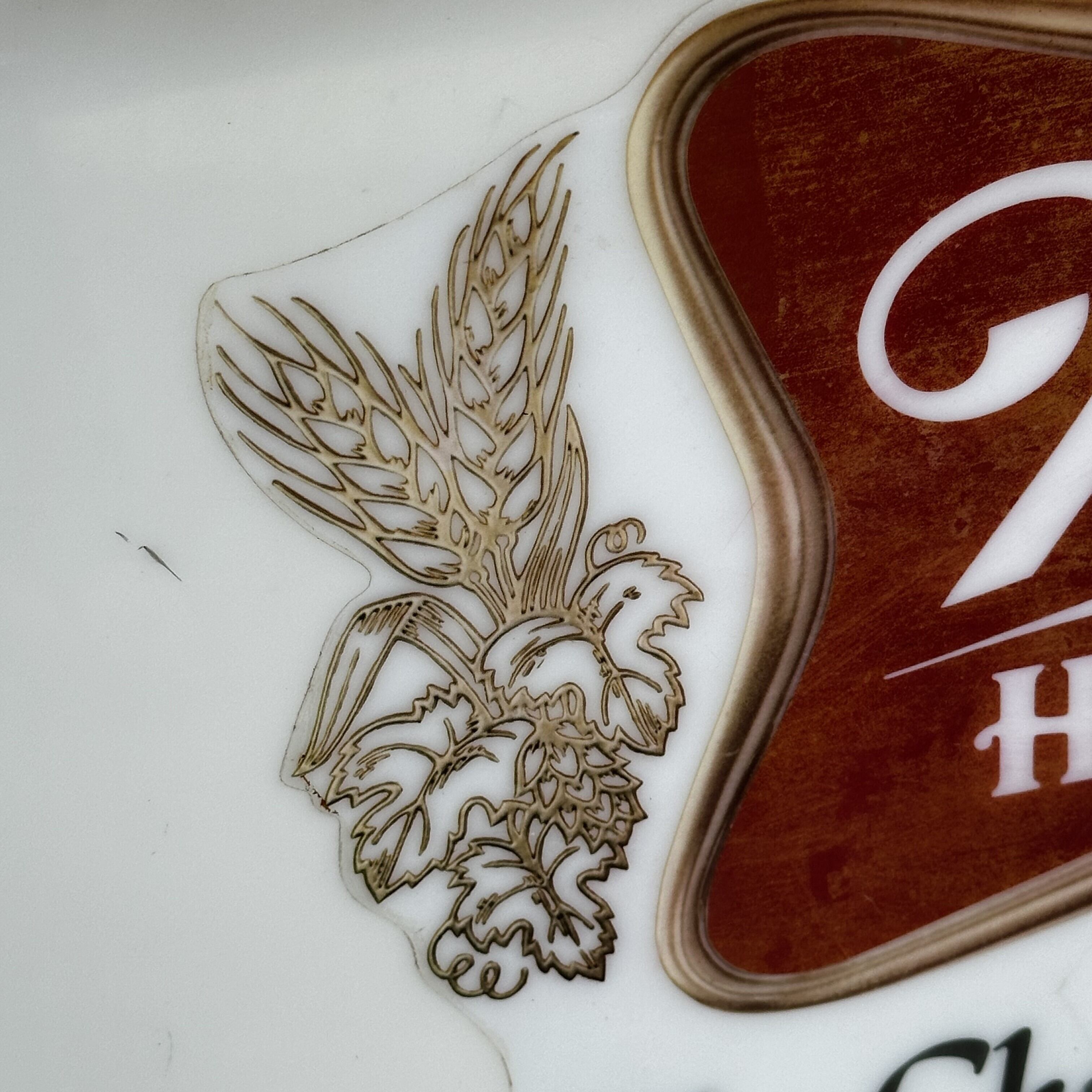 乳白色のプラスチックボディにレッドのロゴとホップのグラフィックが映えるデザインで、バーやガレージ、ヴィンテージ空間のディスプレイに最適です。コレクターズアイテムとしても人気のある一点です。