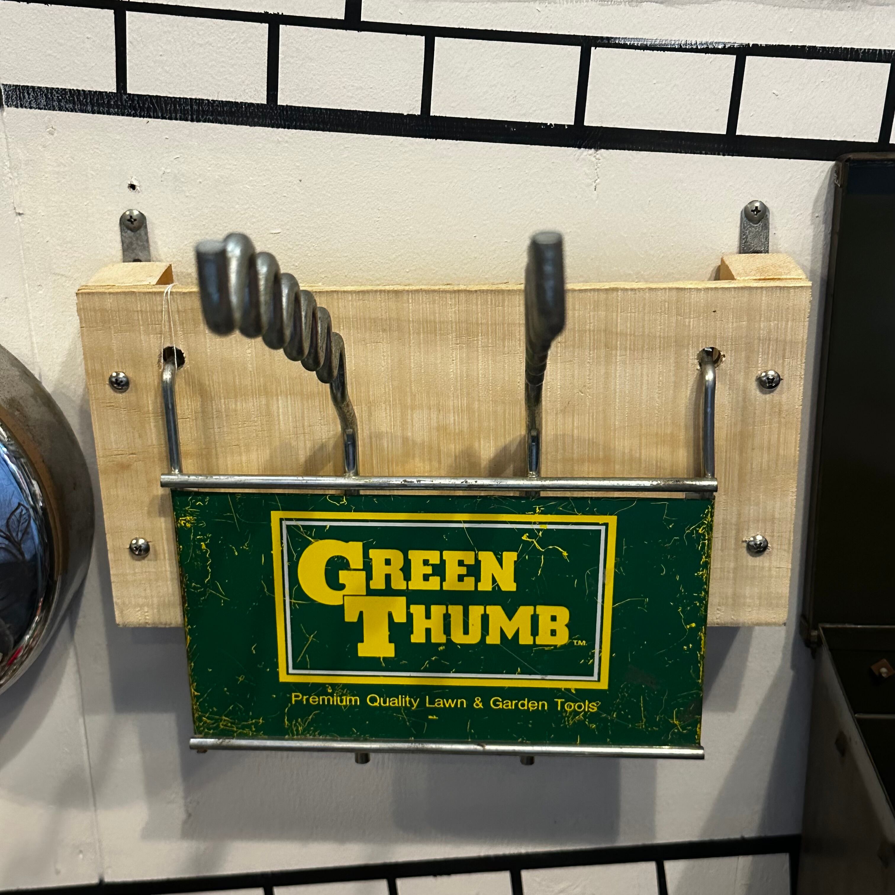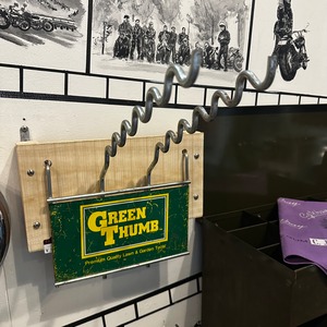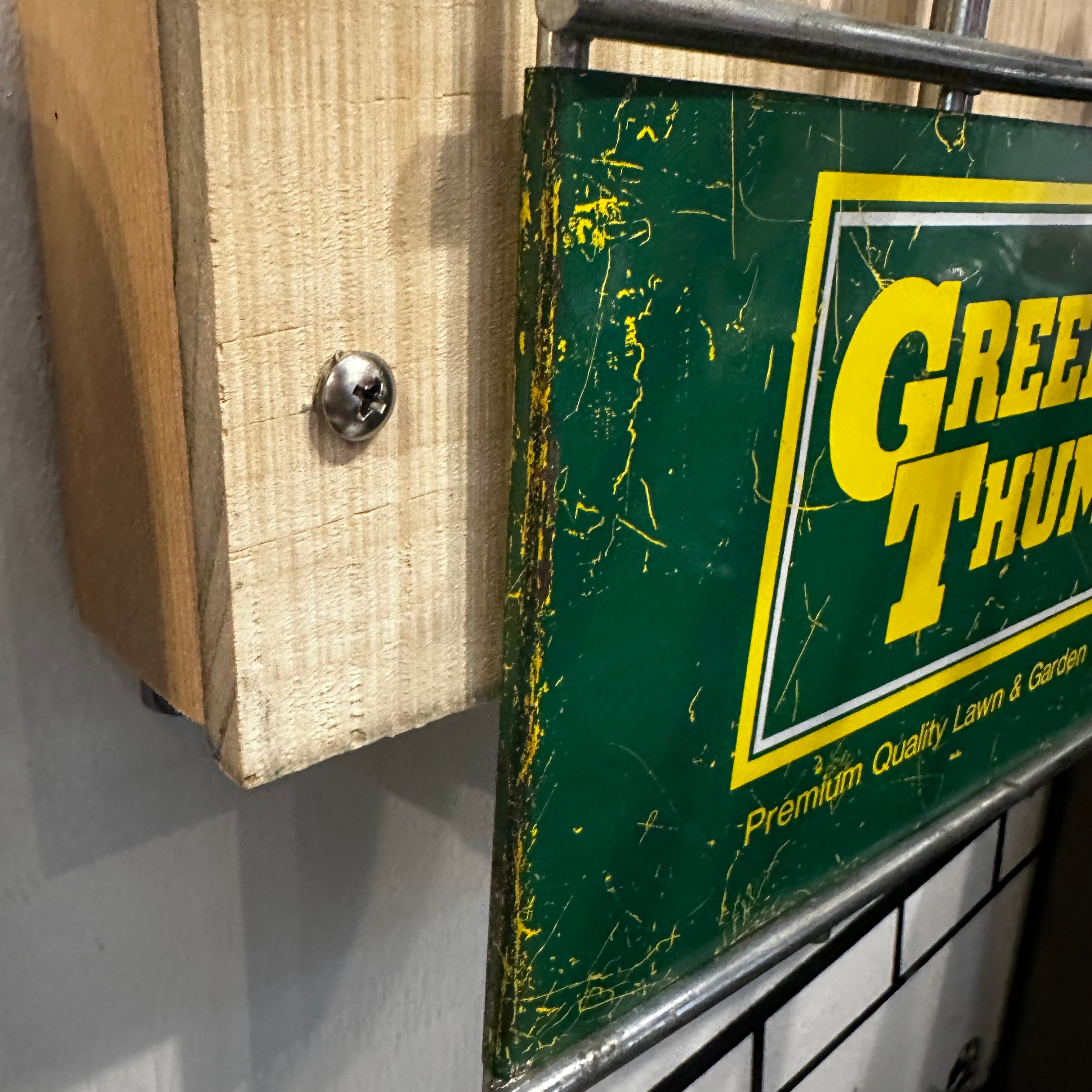 アメリカのガーデニングツールブランド「GREEN THUMB」のワイヤーラックです。レトロなグリーンとイエローのロゴが特徴的で、お庭やガレージ、お部屋のディスプレイにぴったりのアイテムです。ガーデンツールの収納や、ショップのディスプレイ什器、ガレージやリビングの壁面収納など、アイデア次第で様々に活用できます。無骨なワイヤーデザインが、男前インテリアやインダストリアルスタイルのお部屋にぴったりマッチします!!ワイヤーを引っかけている木製の壁掛け用パーツも付属いたしますので、お家ですぐに飾っていただけます!!