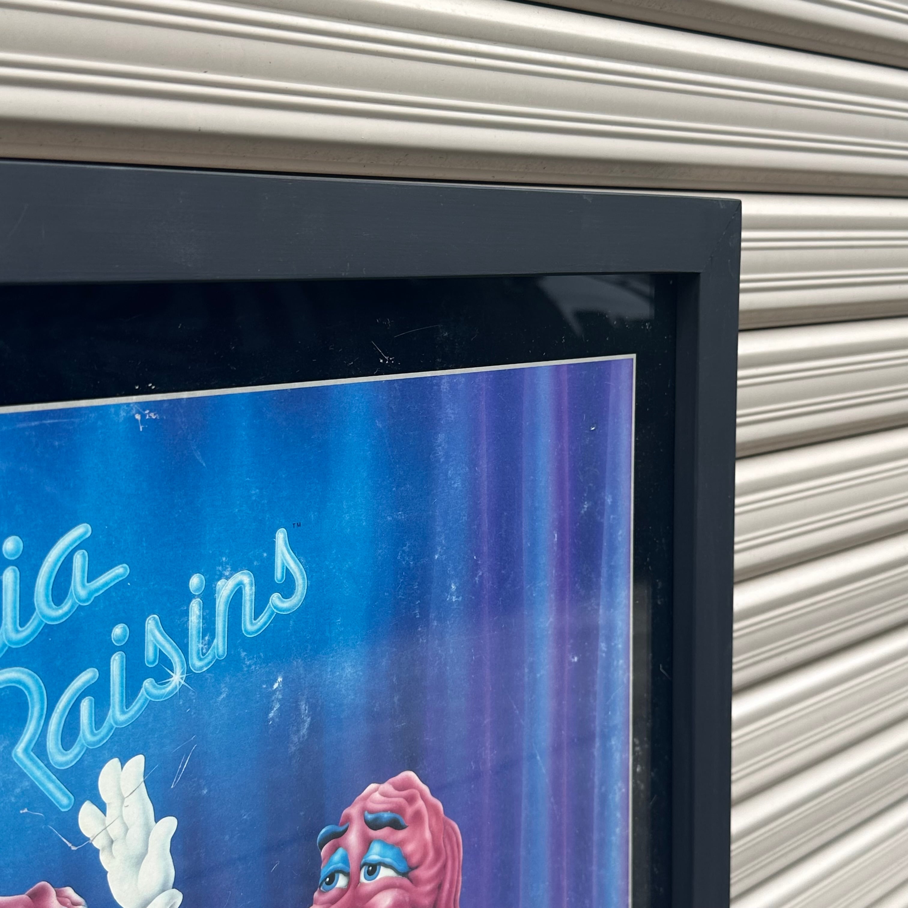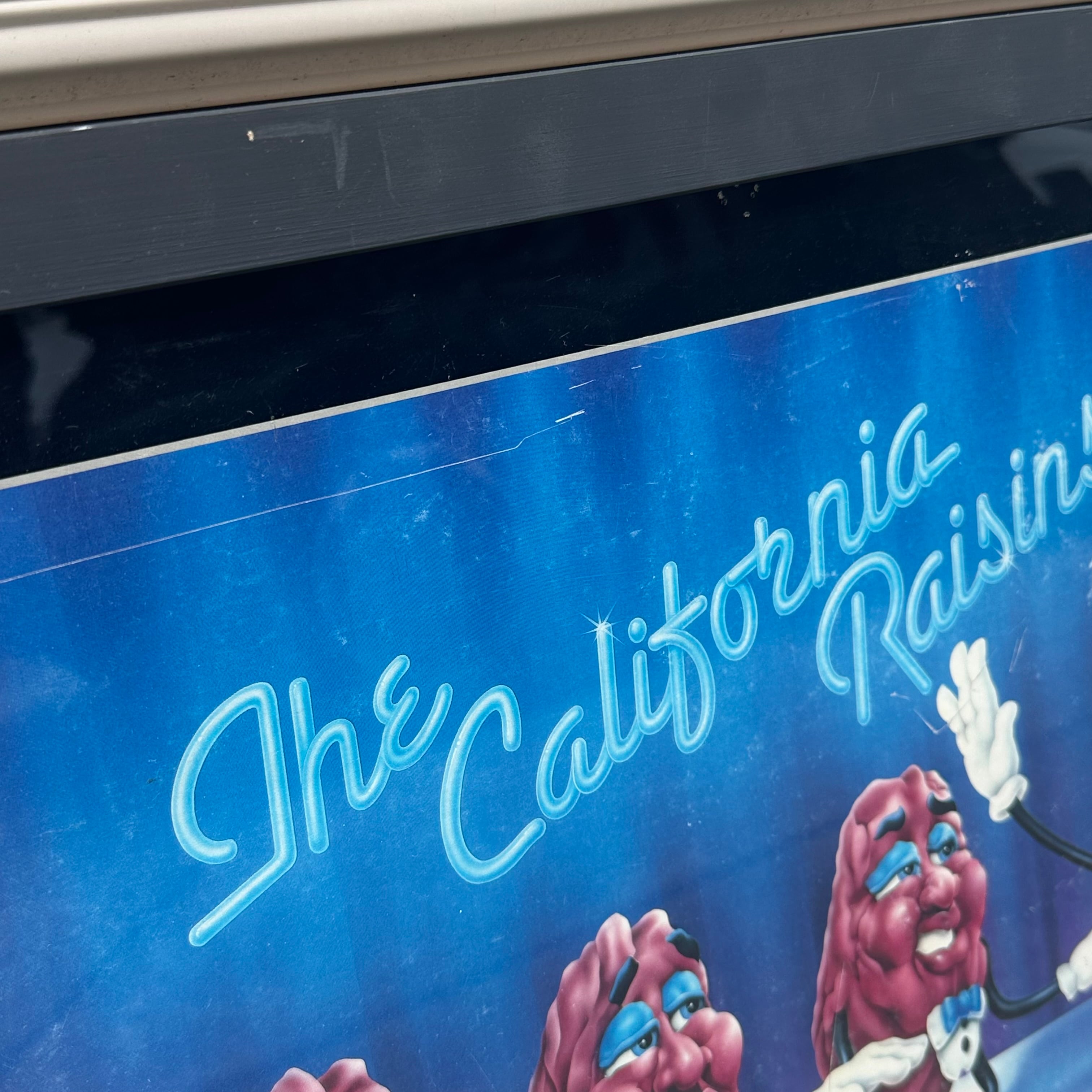 1980年代に人気を博したキャラクター、ザ・カリフォルニア・レーズンズのヴィンテージポスターです。マーヴィン・ゲイのヒット曲「I Heard It Through The Grapevine」を歌うレーズンたちのイラストがデザインされており、当時のアメリカンカルチャーを感じさせる貴重なアイテムです。