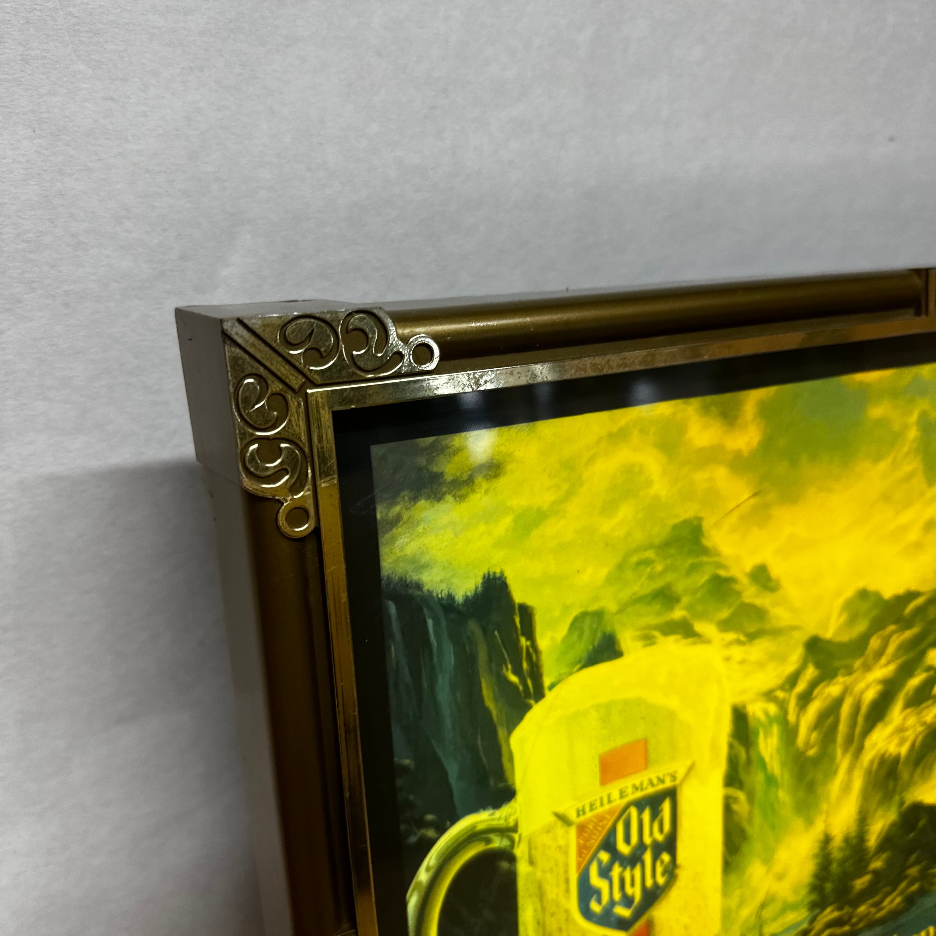 アメリカの老舗ビールブランド「Heileman's Old Style(オールドスタイル)」のヴィンテージ広告パネルです。「Brewed with water from when the earth was pure(地球が純粋だった頃の水で醸造)」というキャッチコピーと、幻想的な自然風景が印象的。下部時計付き(時計は正常に動作しません。デザイン部分のライトは問題無く点灯いたします。)、ゴールドフレームが高級感を演出しています。