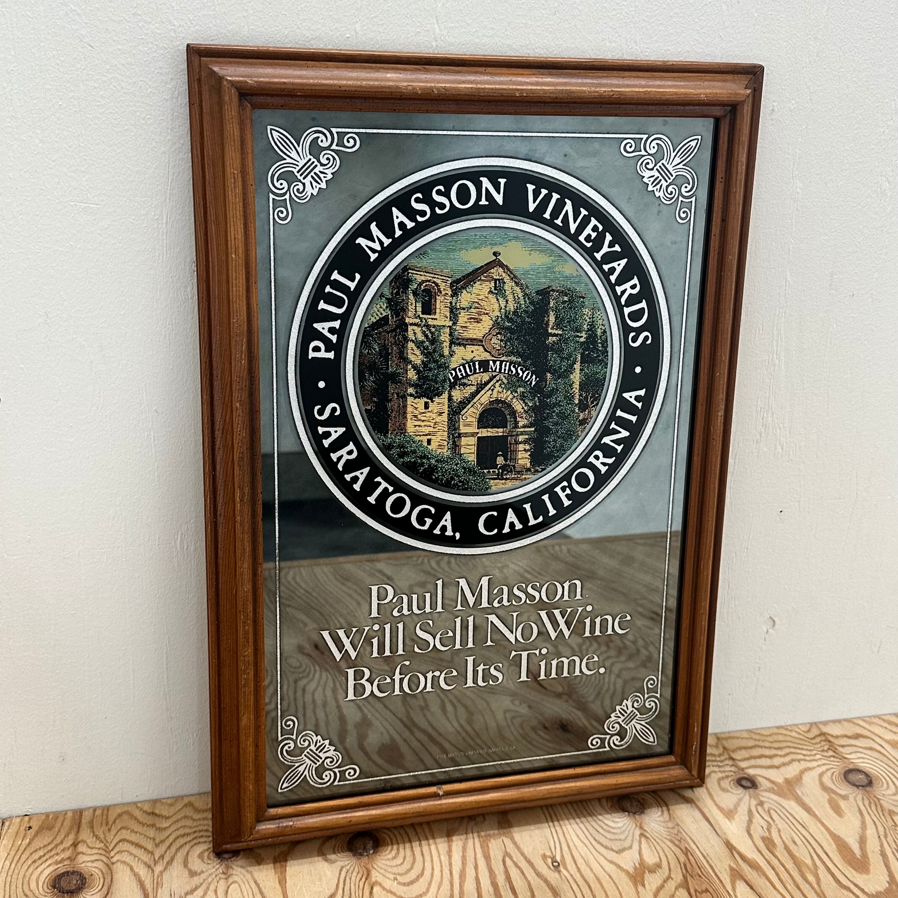 カリフォルニアのワイン、PAUL MASSON「ポールマッソン」のパブミラーです。ミラーの部分がスモークがかっており、他にはないデザインです。パブミラーというとビールのイメージが強いかと思いますが、ワインのパブミラーも実はたくさん販促品用として生産されています。お部屋やガレージのディスプレイに是非いかがでしょうか。