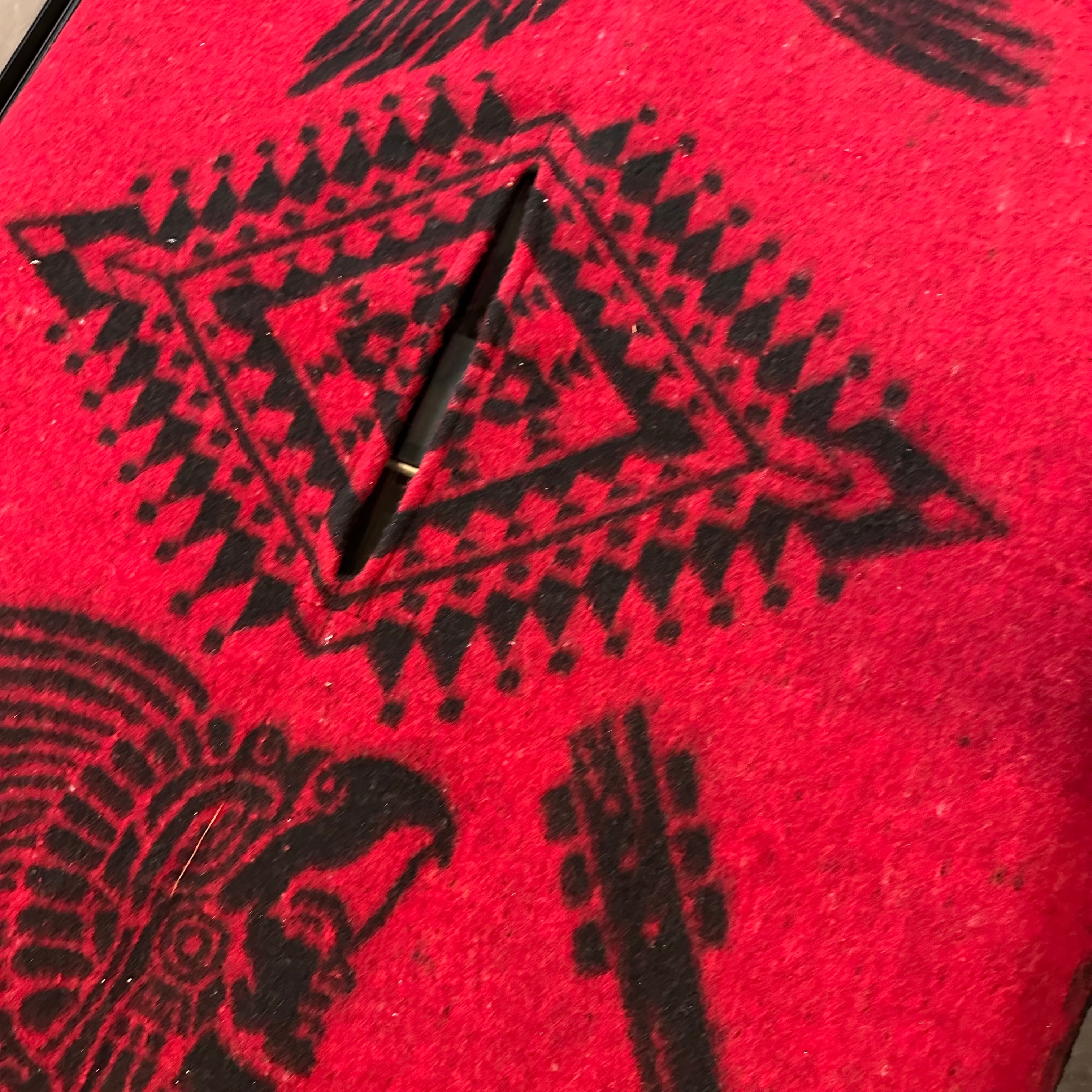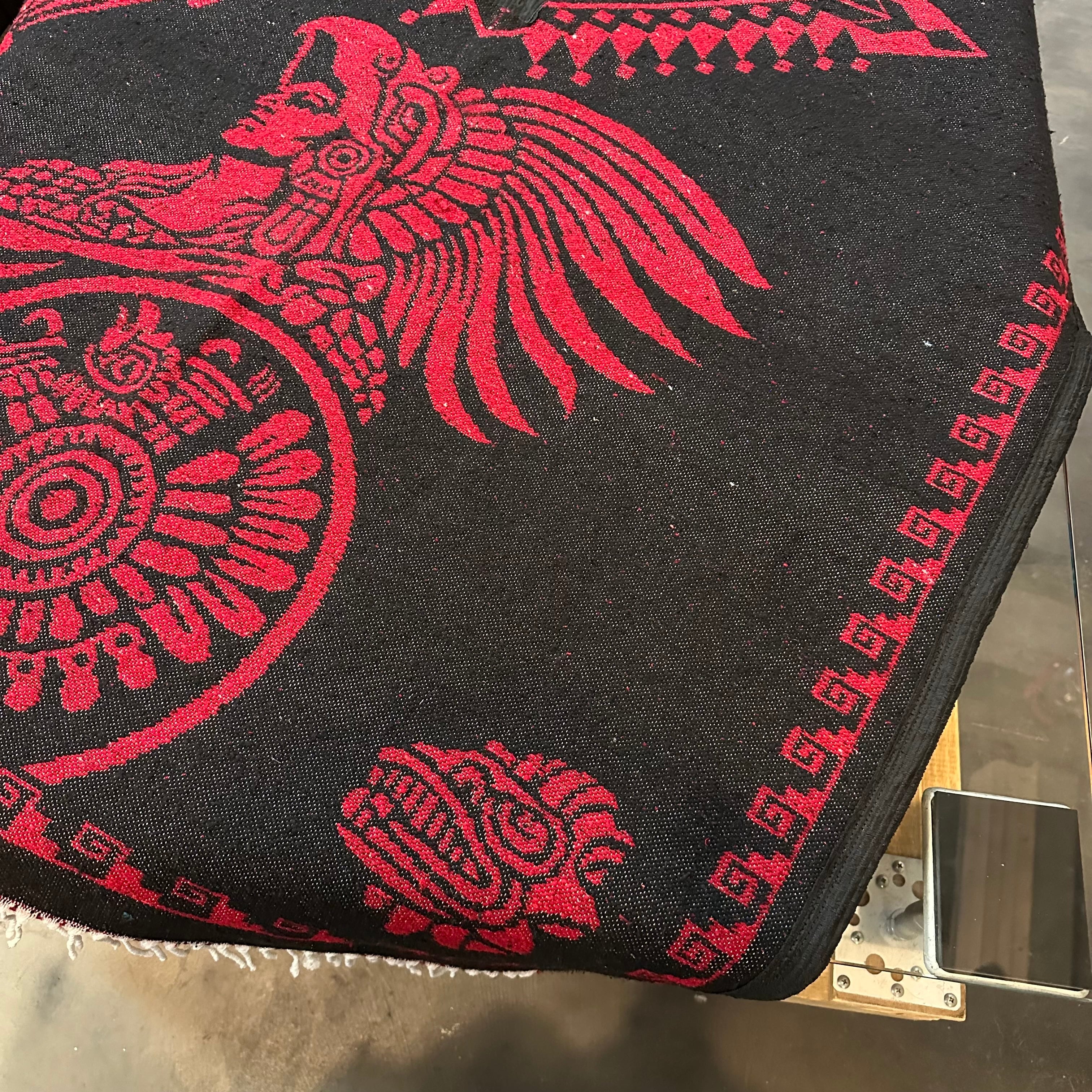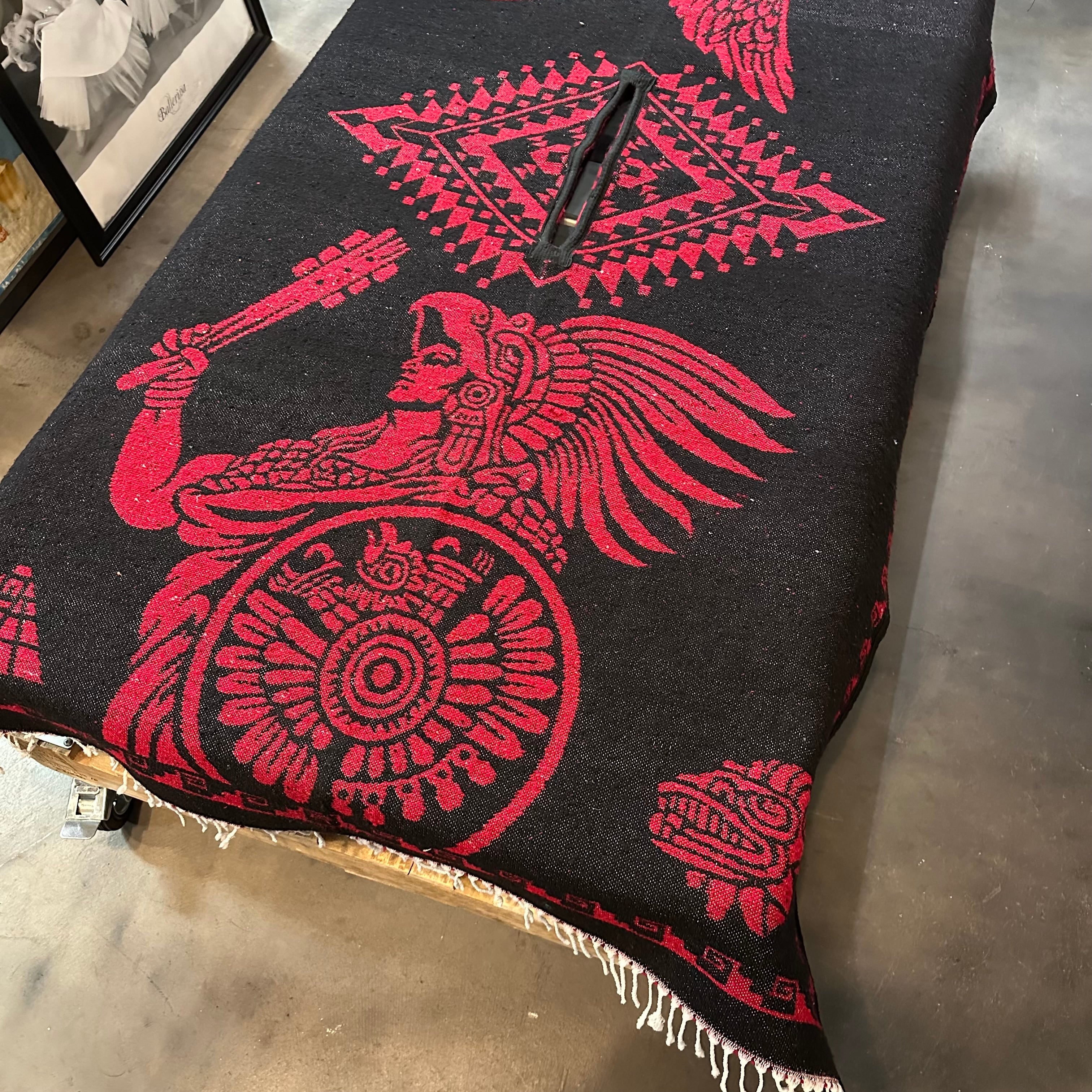 メキシコ製 "アステカ" パターン ポンチョ | メキシカンラグ ネイティブ柄 レッドブラック