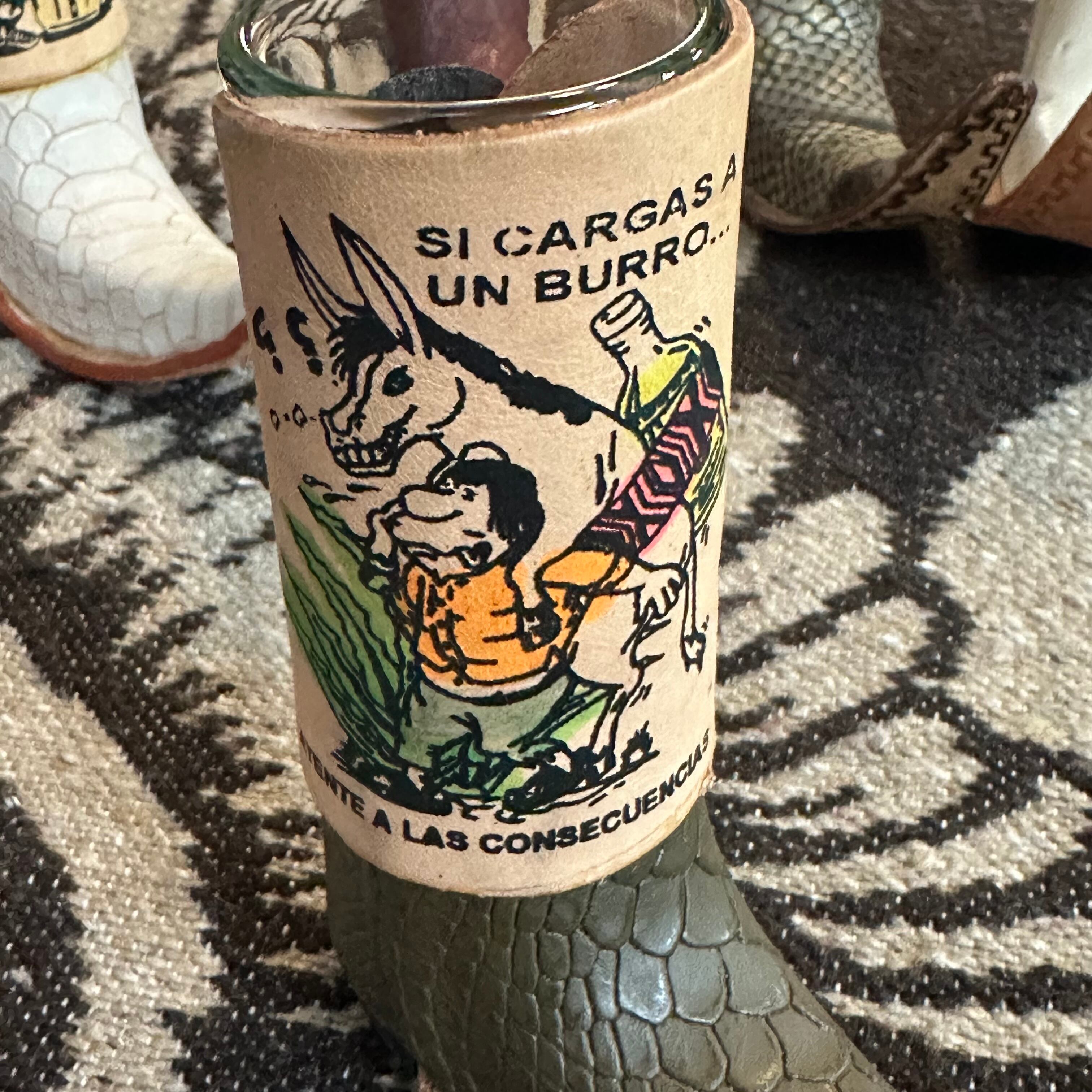 ミニチュアのウエスタンブーツ型テキーラショットグラスです。本革製のブーツカバーは、メキシコの職人によるハンドメイドで、個性的なイラストが描かれています。テキーラのショットグラスとしてはもちろん、インテリアとして飾ったり、一輪挿しやペン立てとしてお使いいただくことも可能です。