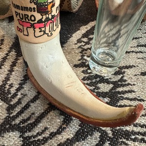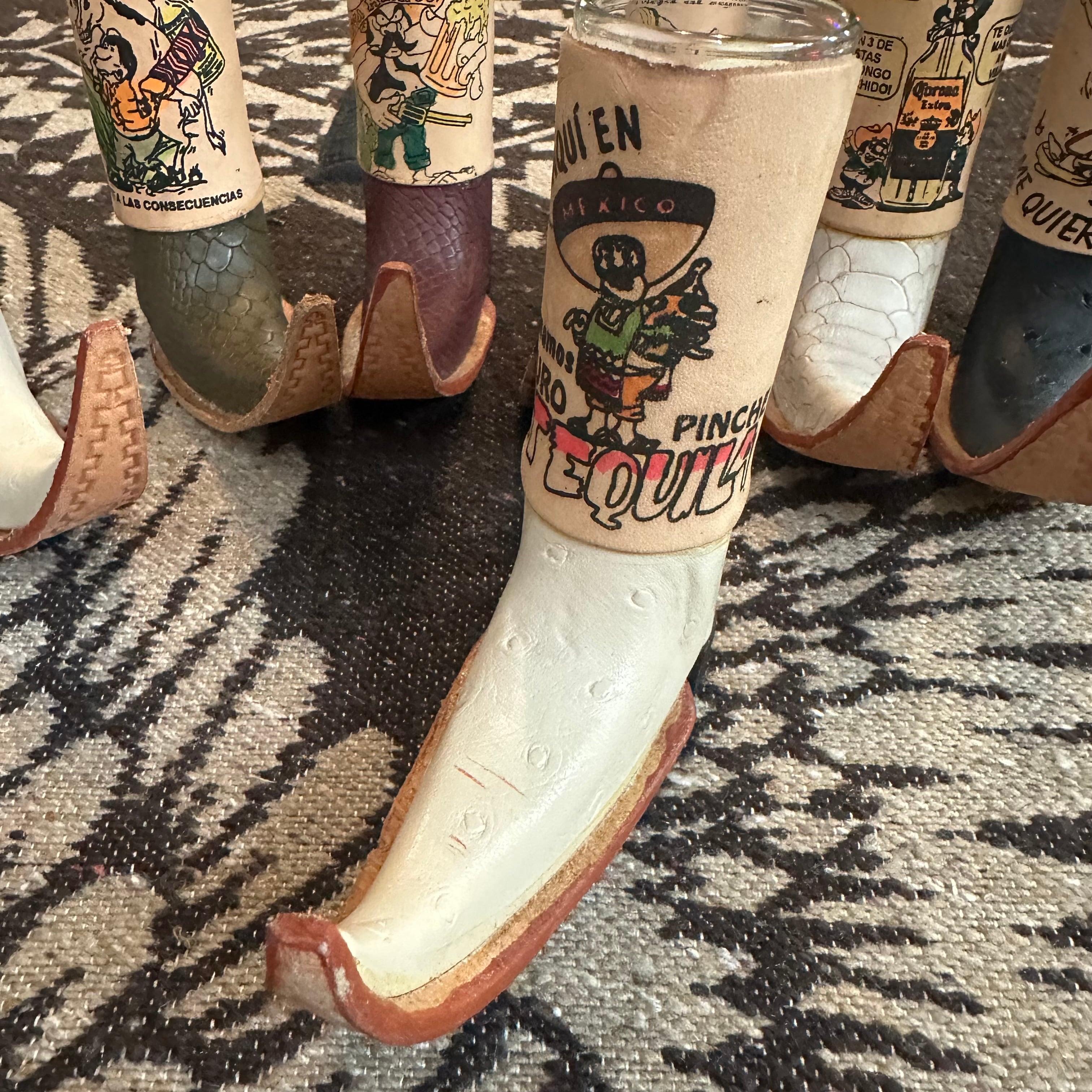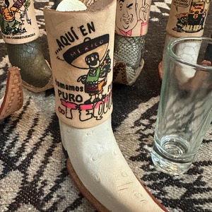 ミニチュアのウエスタンブーツ型テキーラショットグラスです。本革製のブーツカバーは、メキシコの職人によるハンドメイドで、個性的なイラストが描かれています。テキーラのショットグラスとしてはもちろん、インテリアとして飾ったり、一輪挿しやペン立てとしてお使いいただくことも可能です。