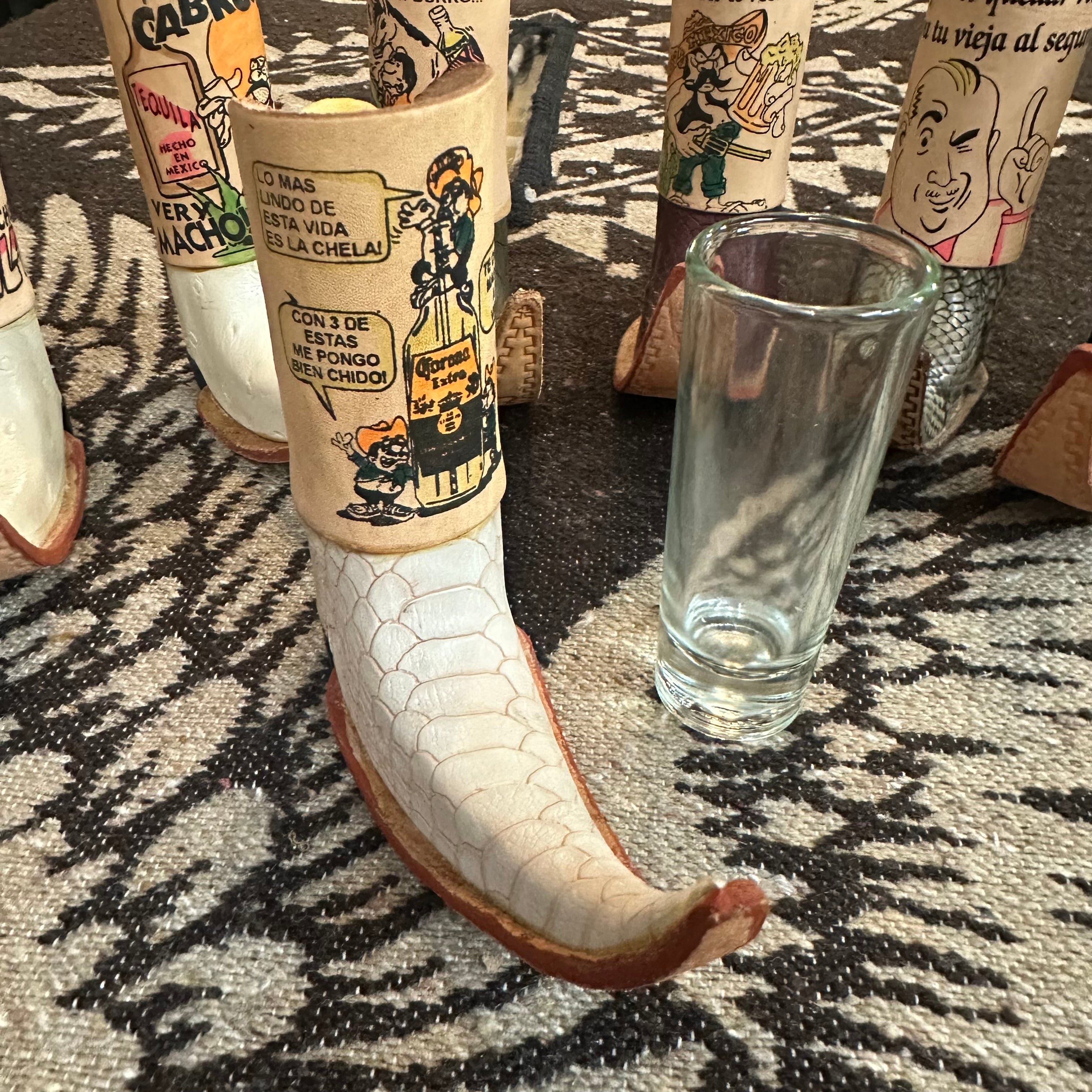 ミニチュアのウエスタンブーツ型テキーラショットグラスです。本革製のブーツカバーは、メキシコの職人によるハンドメイドで、個性的なイラストが描かれています。テキーラのショットグラスとしてはもちろん、インテリアとして飾ったり、一輪挿しやペン立てとしてお使いいただくことも可能です。