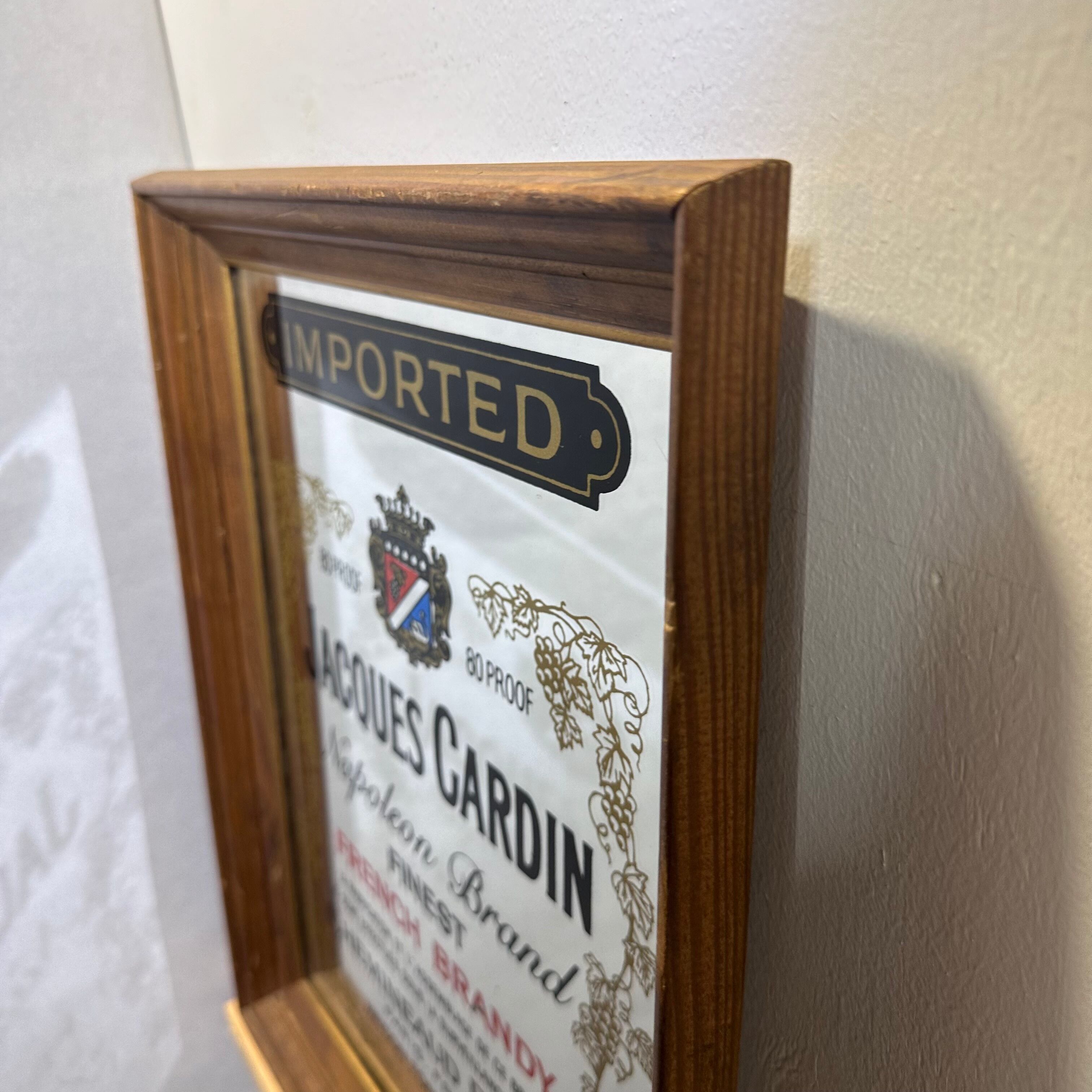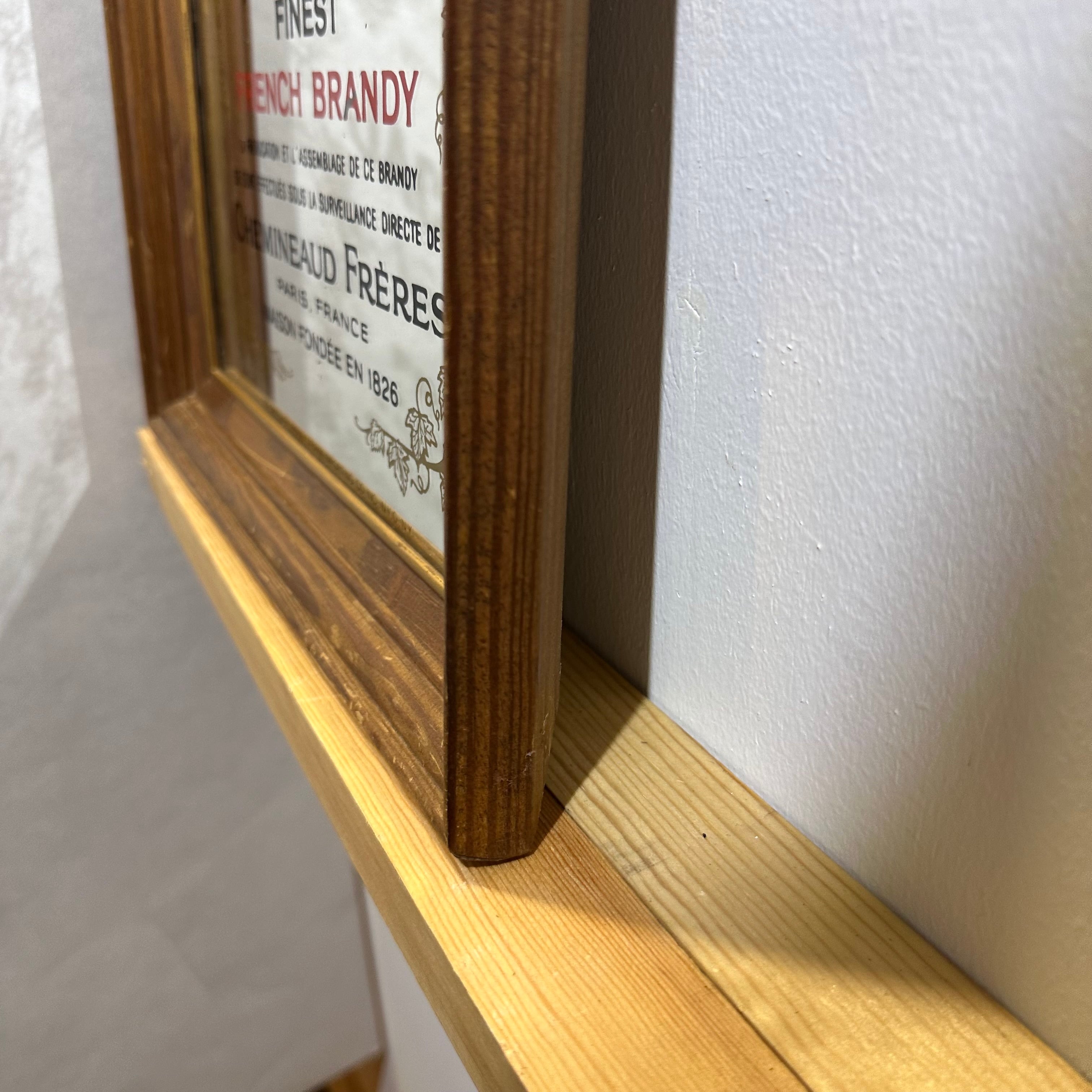 「IMPORTED」や「FINEST FRENCH BRANDY」といった文字、そして王冠と盾があしらわれたデザインは、高級感とヴィンテージならではの重厚な雰囲気を醸し出しています。経年による木製フレームの風合いや、ミラー部分の落ち着いた質感が、空間に深みを与えます。バーカウンターや書斎、ガレージなど、こだわりのインテリアとして飾るだけで、ノスタルジックで魅力的な空間を演出します。