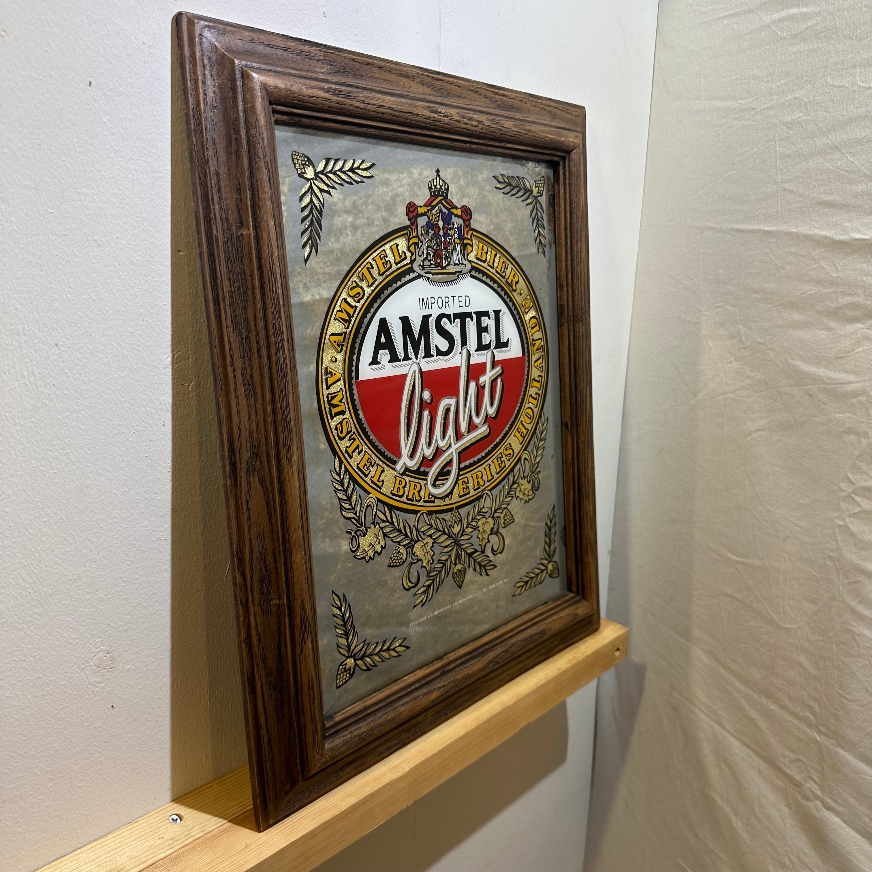 オランダの老舗ビールブランド「Amstel(アムステル)」の広告用パブミラーです。「IMPORTED」と書かれたロゴや、王冠と盾の紋章がデザインされた、歴史と風格を感じさせるアイテムです。