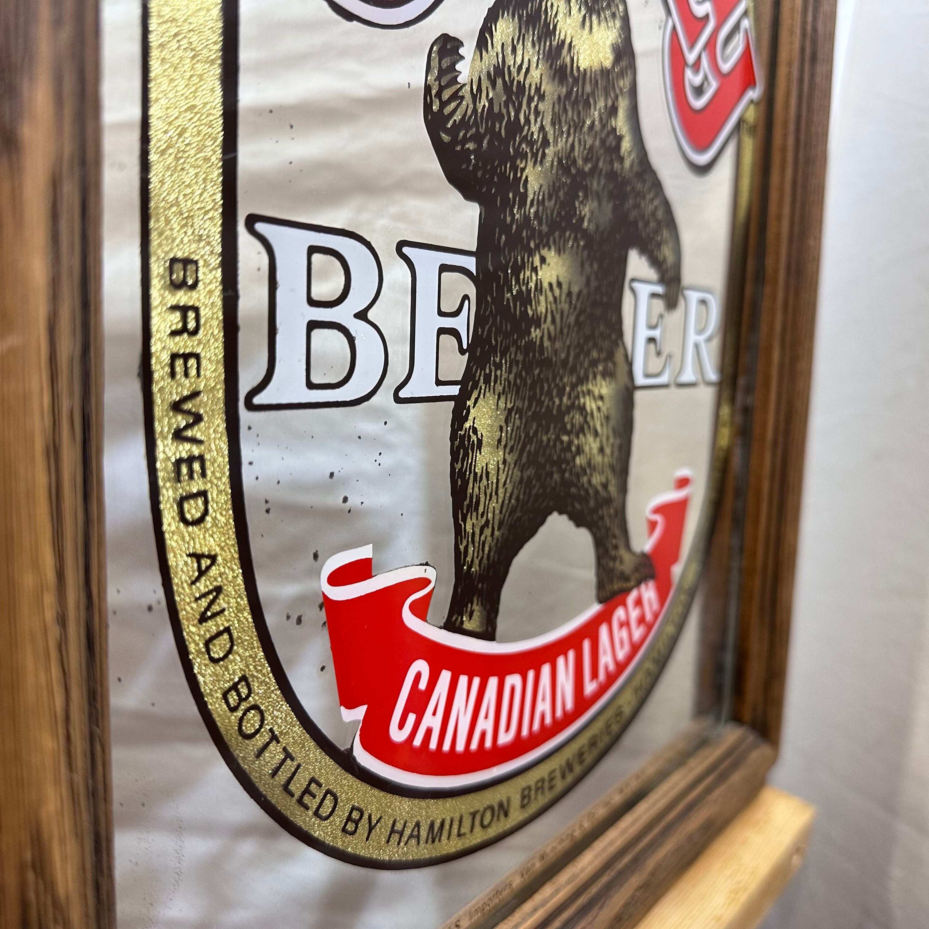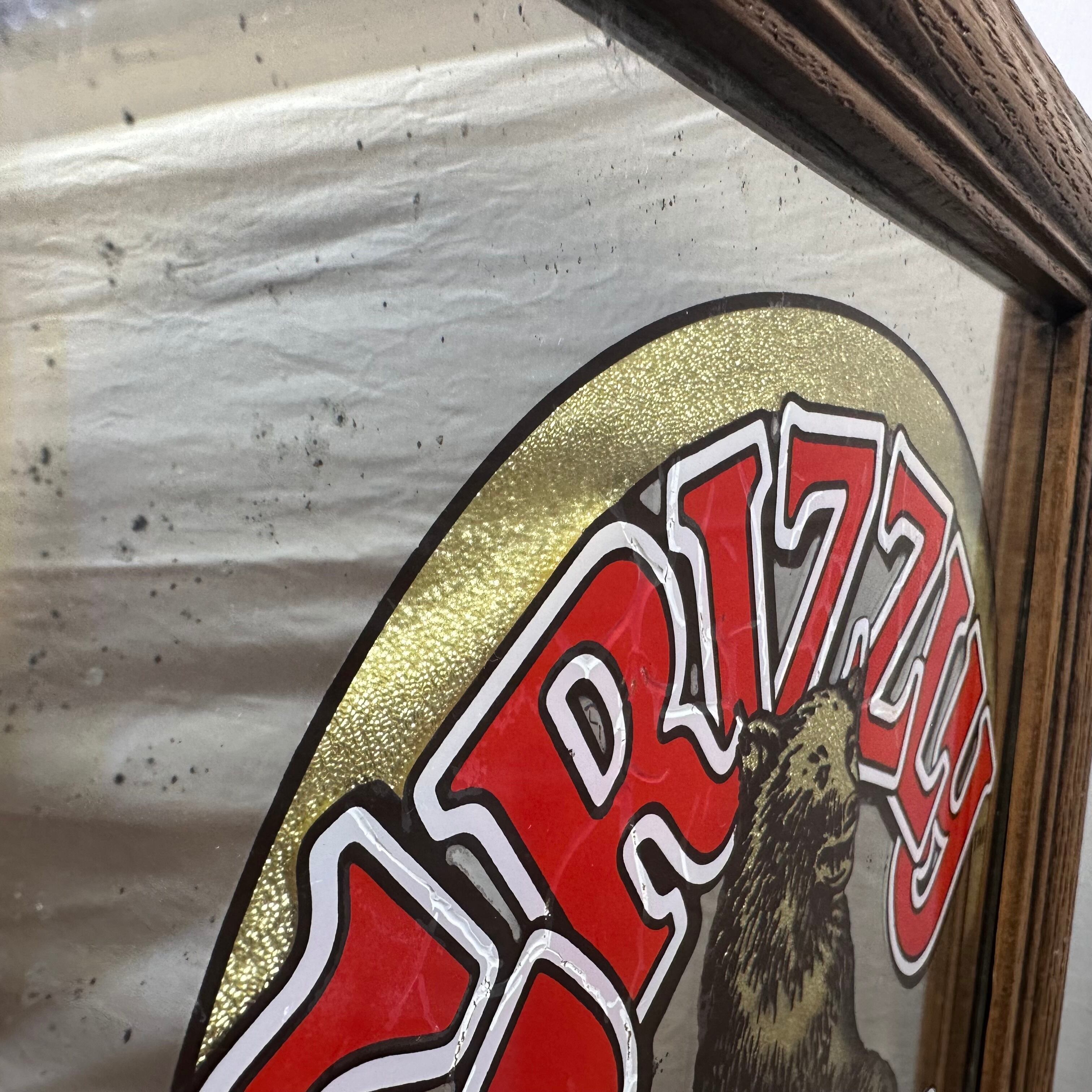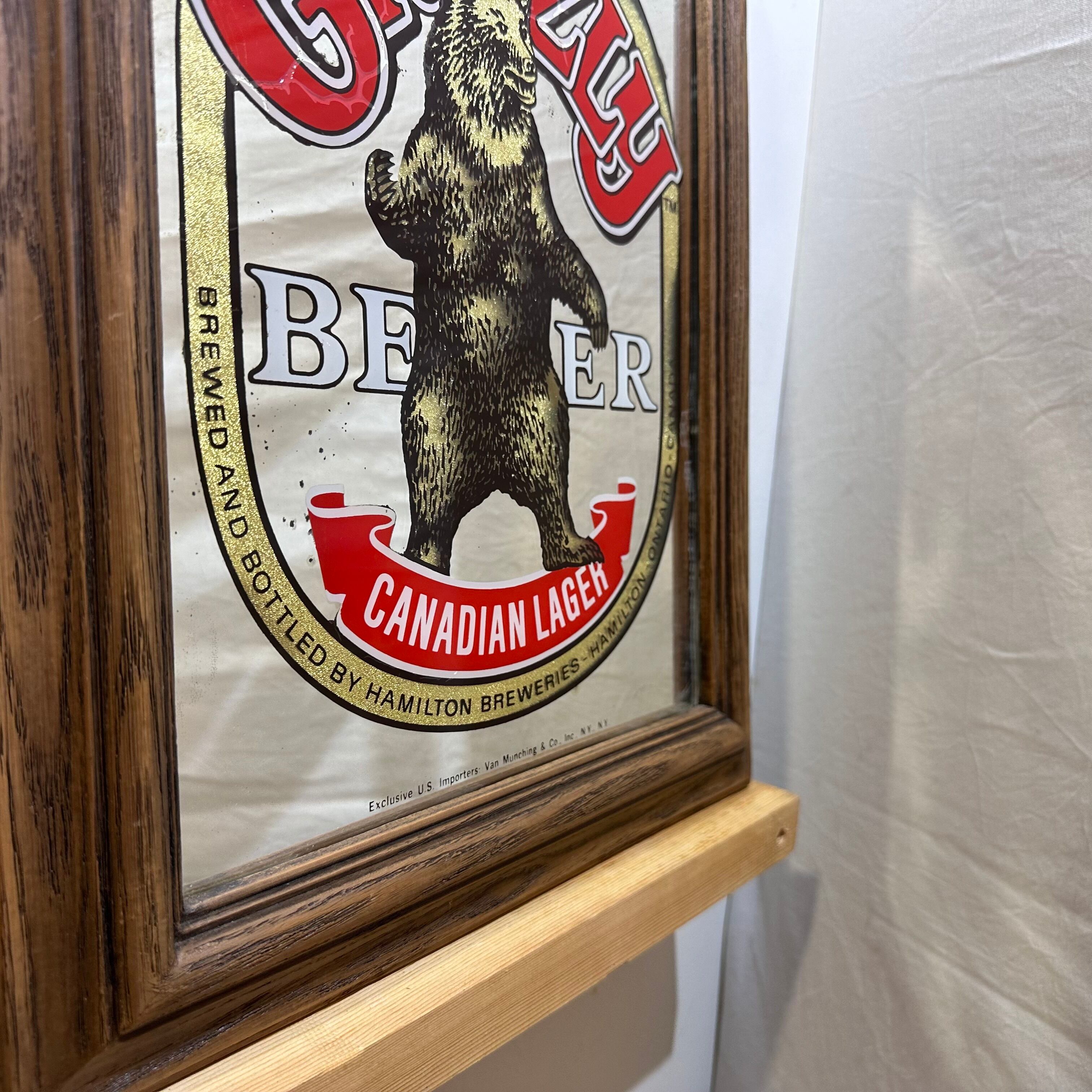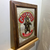 カナダのビールブランド「Grizzly Beer(グリズリービール)」の広告用パブミラーです。力強く立ち上がったグリズリーベアのデザインと、鮮やかなロゴの組み合わせが目を引く、存在感のあるヴィンテージアイテムです。