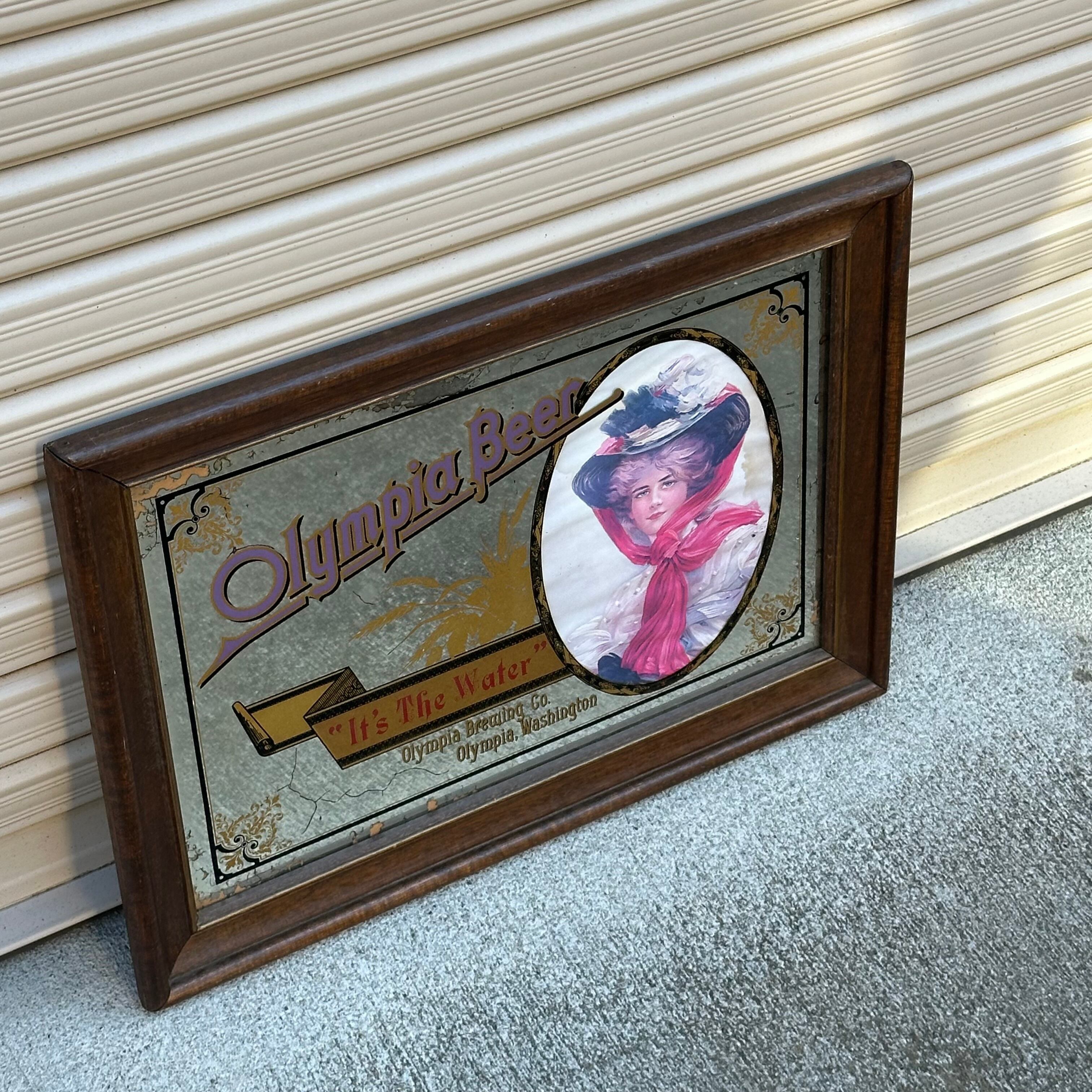 1896年に設立され、2003年までワシントン州で愛されていた歴史あるビールブランド「Olympia Beer」のパブミラーです。「It's The Water」というスローガンと、エレガントな女性のイラストが特徴的な、希少なヴィンテージ品となります。