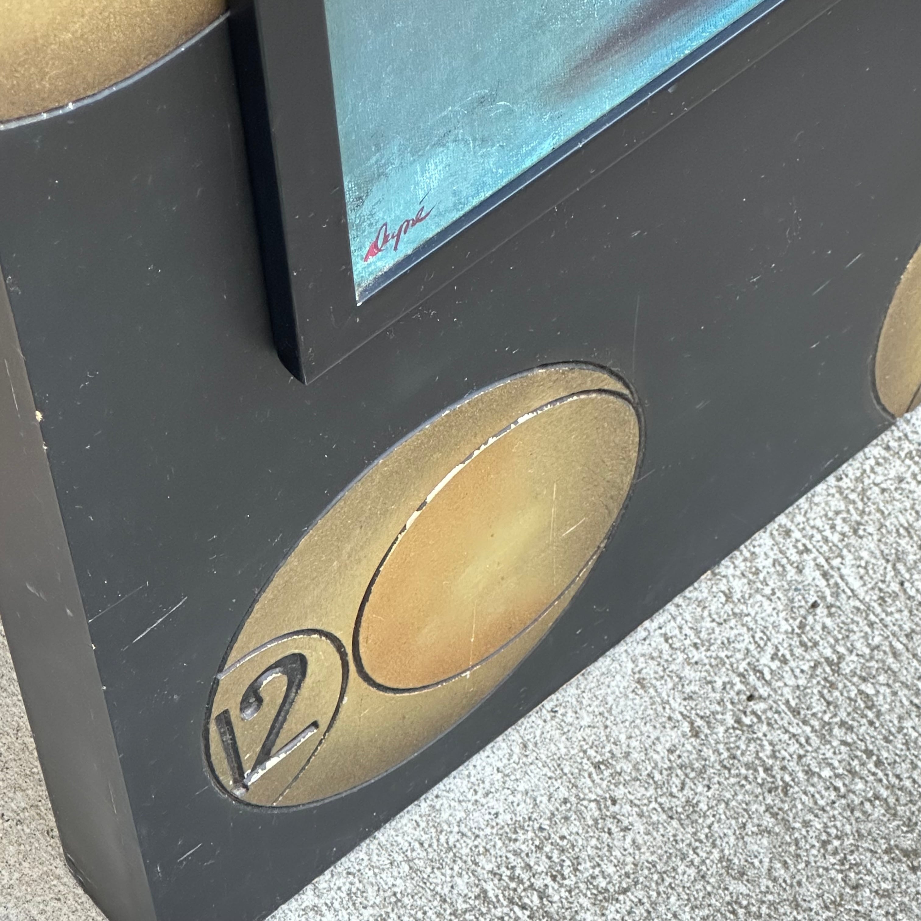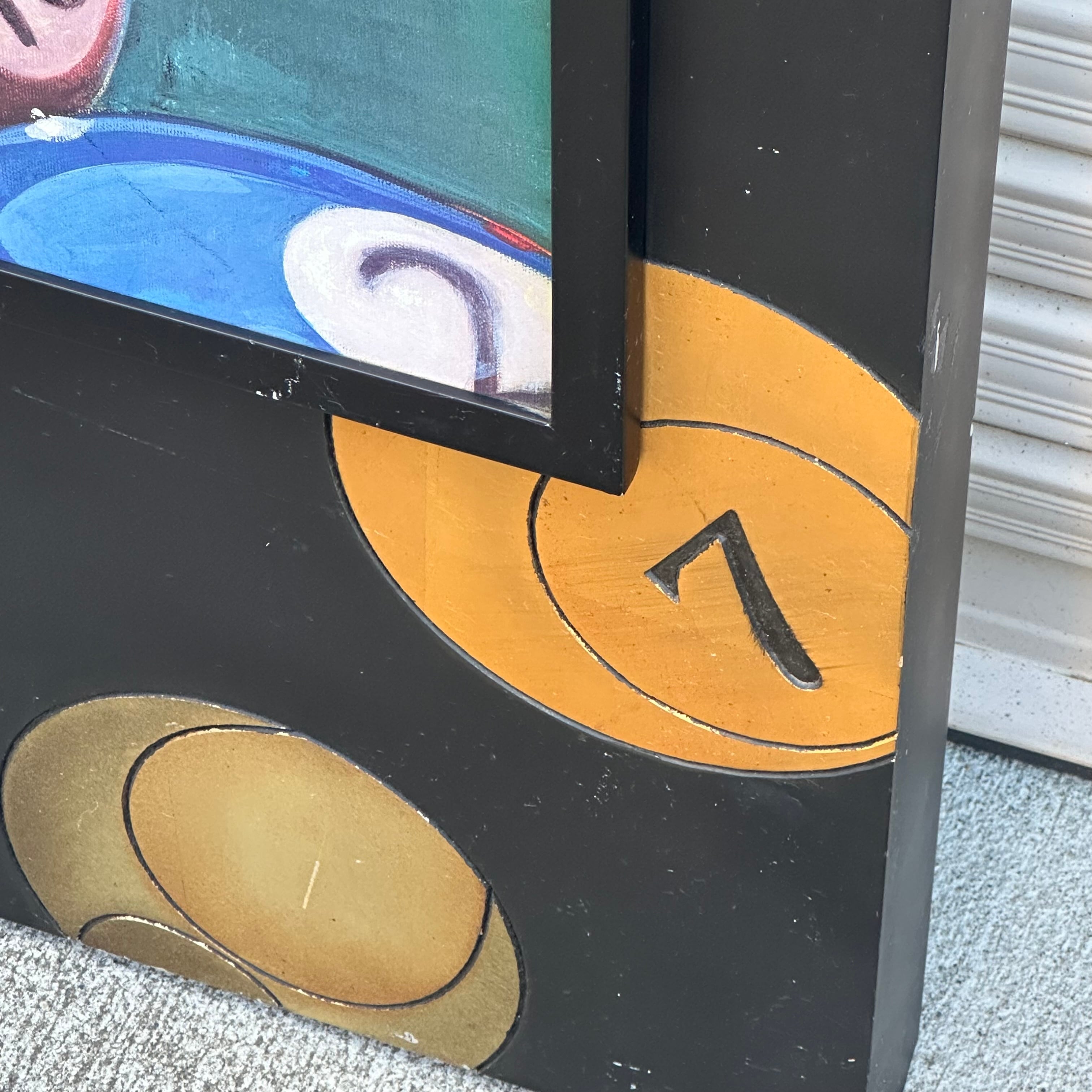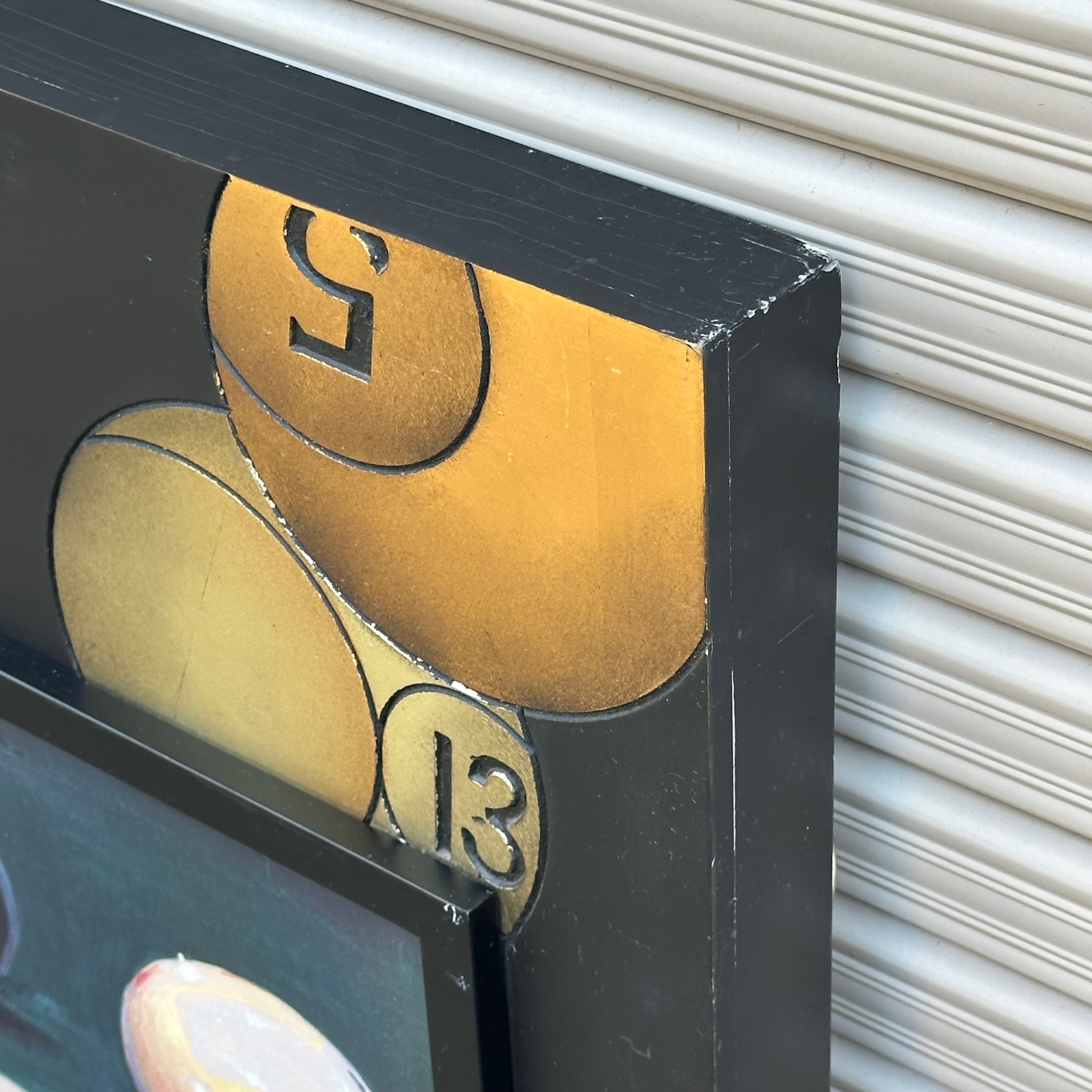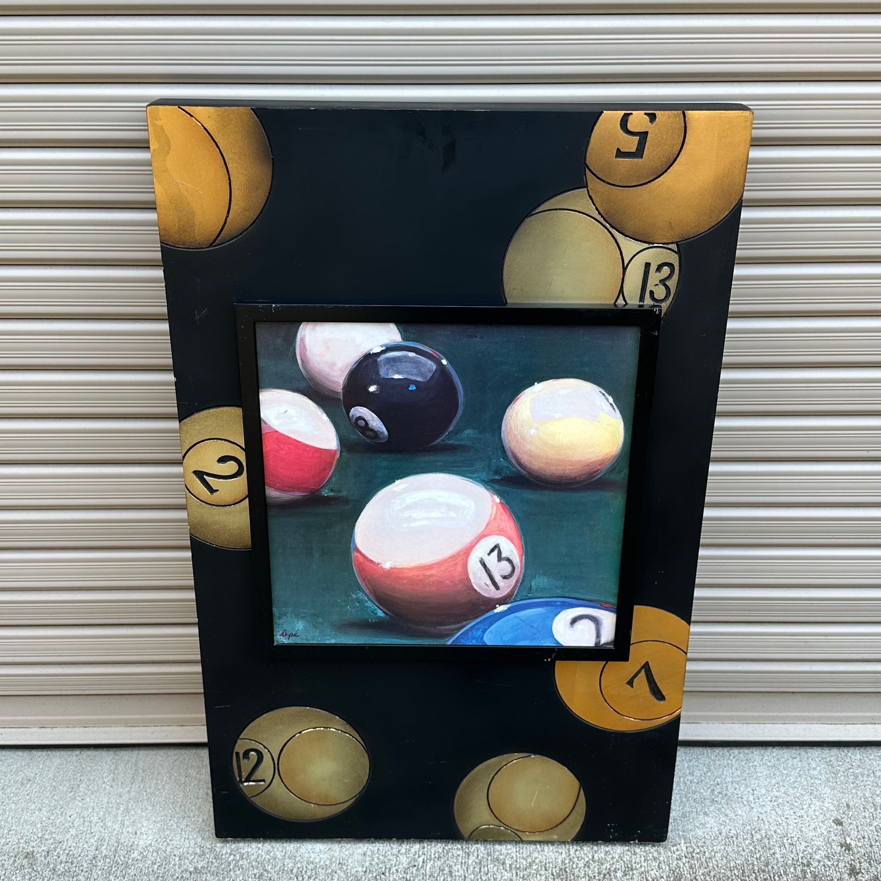 本体にはビリヤードボールの絵柄がダイナミックに彫られており、中央にはビリヤード台の様子を描いた絵がはめ込まれています。(写真では分かりづらいですが、ペイントのような施しがされております。)