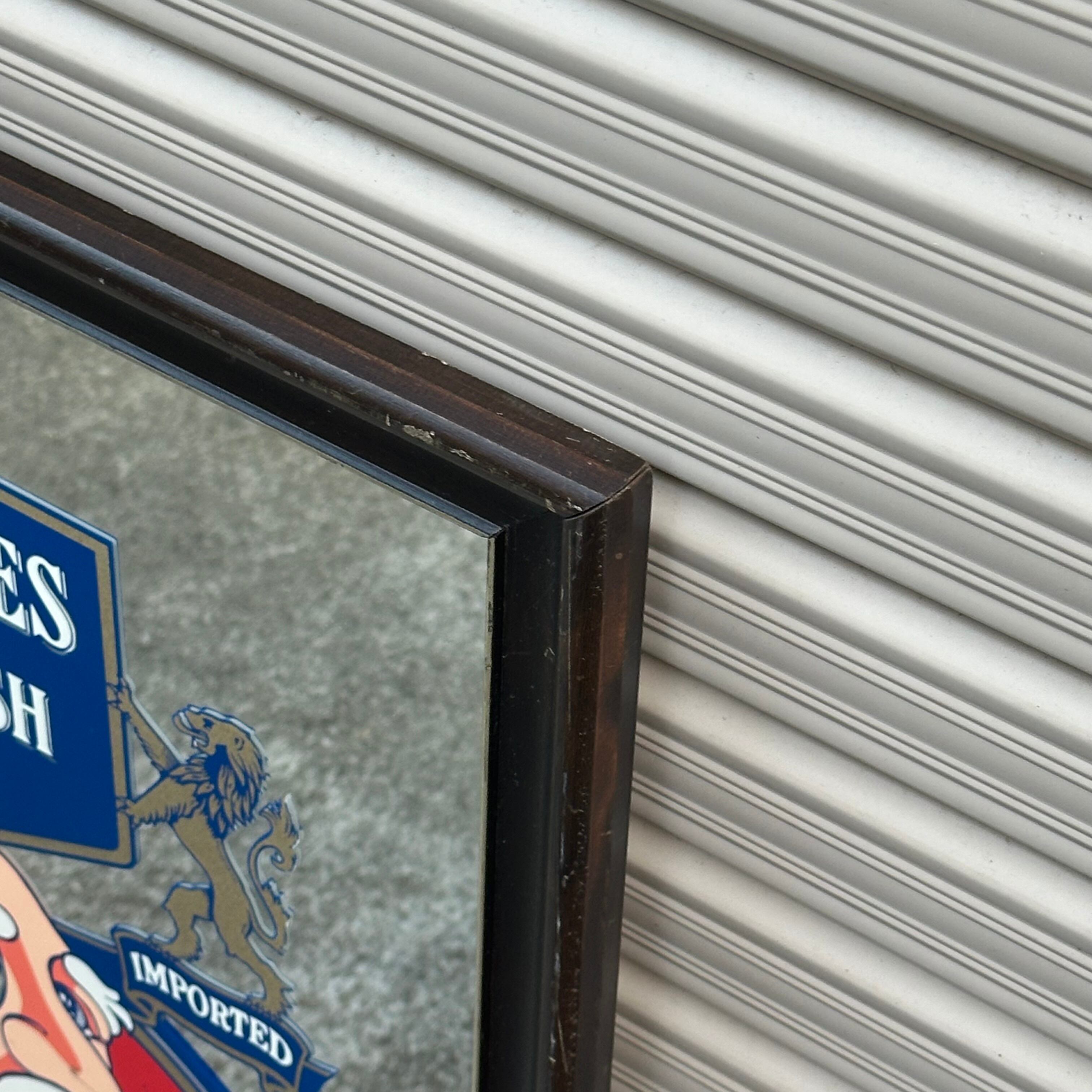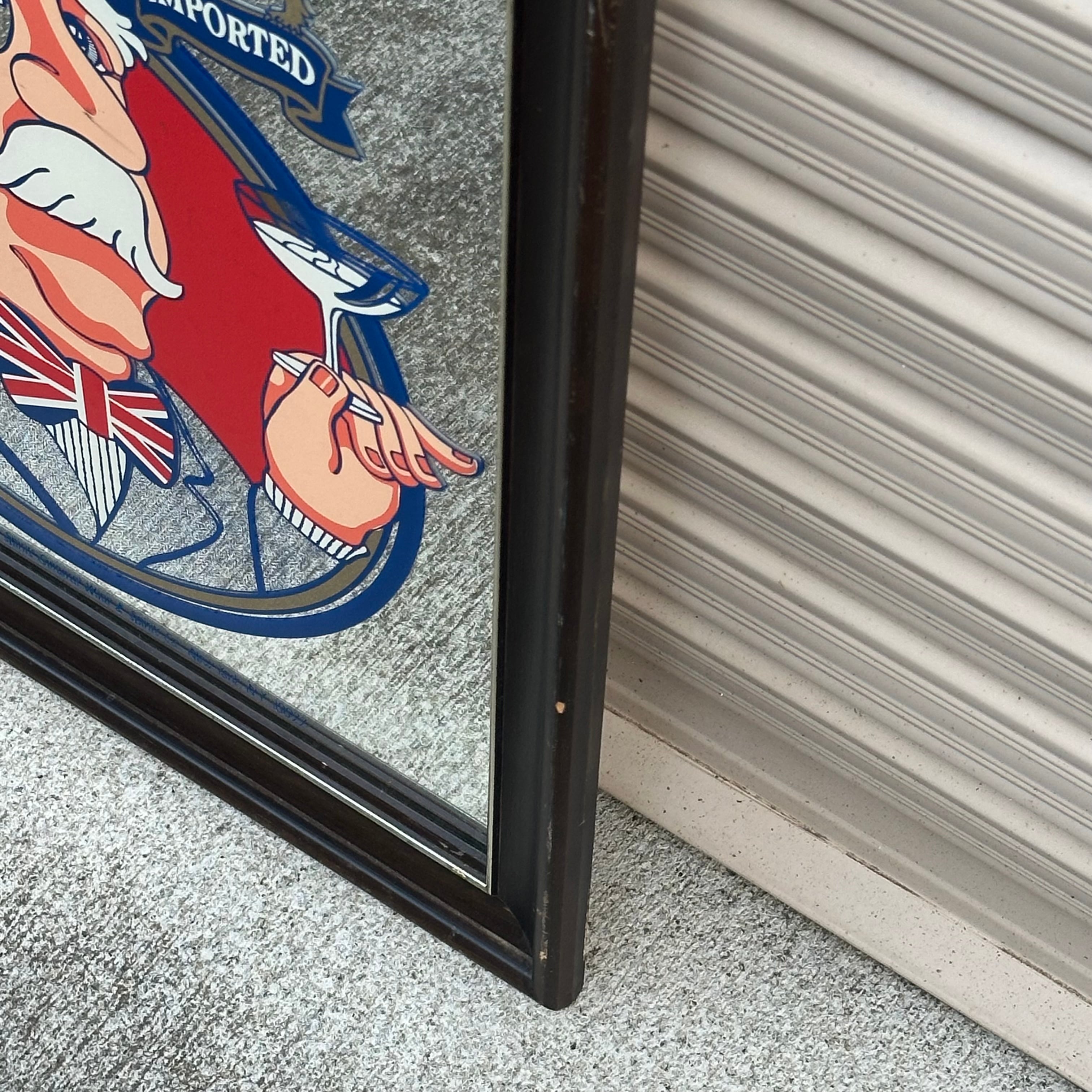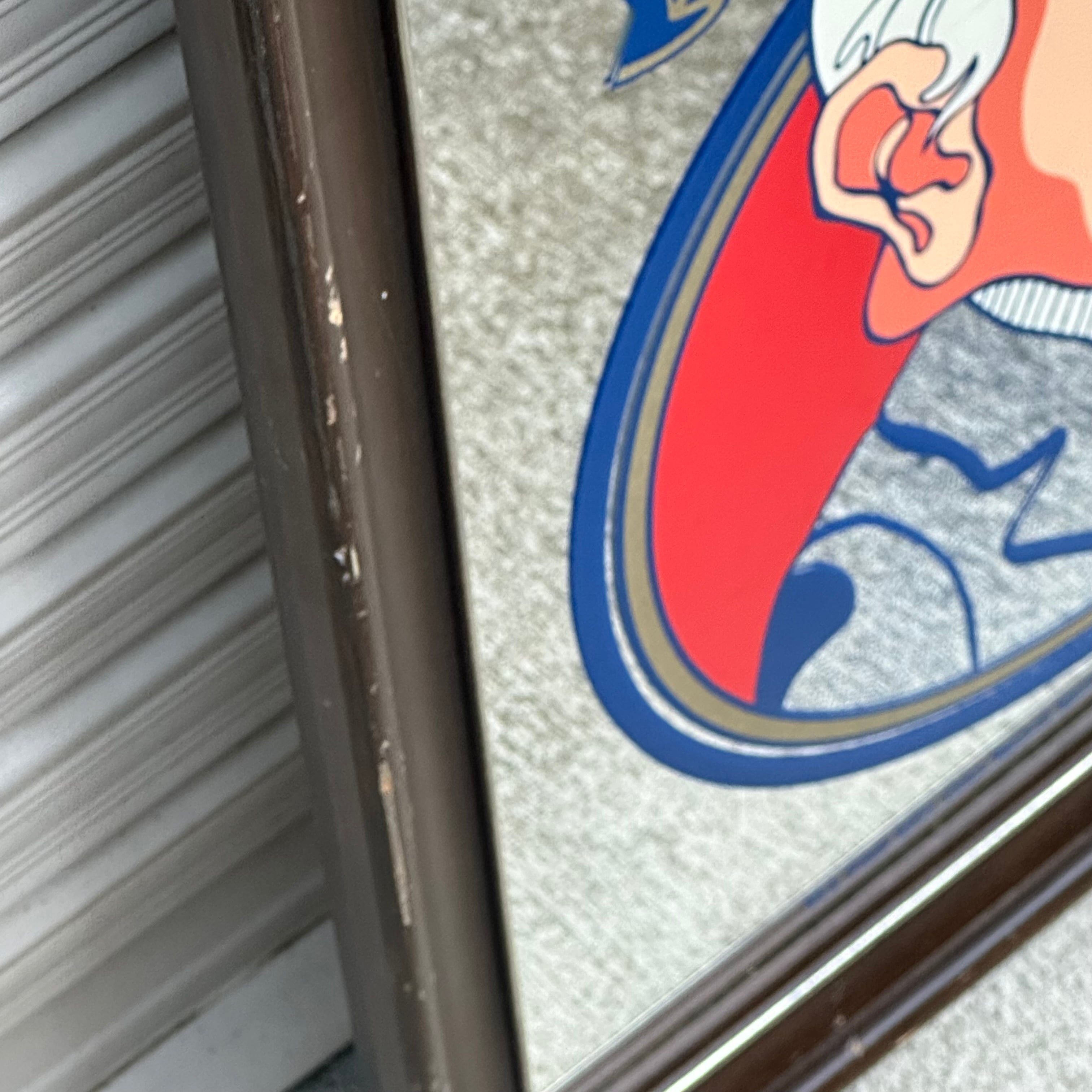 クラシックなイラストと鮮やかな色彩が特徴で、木製の重厚なフレームが雰囲気を引き立てています。リビングやガレージ、バーカウンターのディスプレイなど、インテリアのアクセントとしておすすめです!!遊び心のあるデザインが可愛らしくて、他のパブミラーには無い路線な気がします。この機会に是非ゲットしてみてください♪