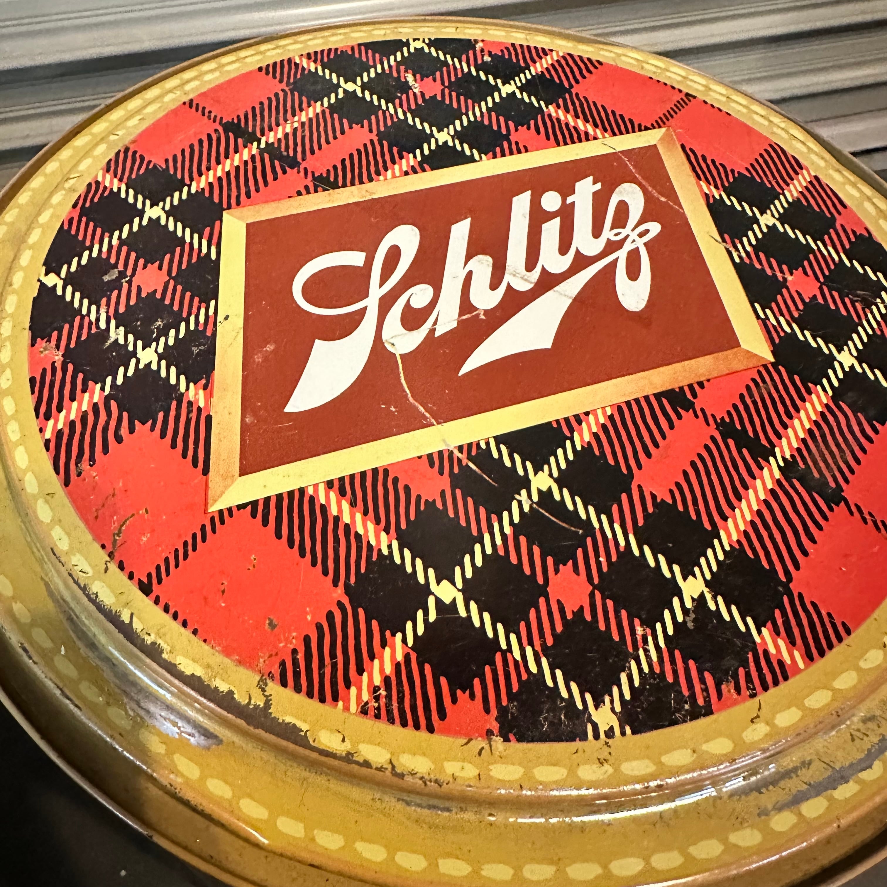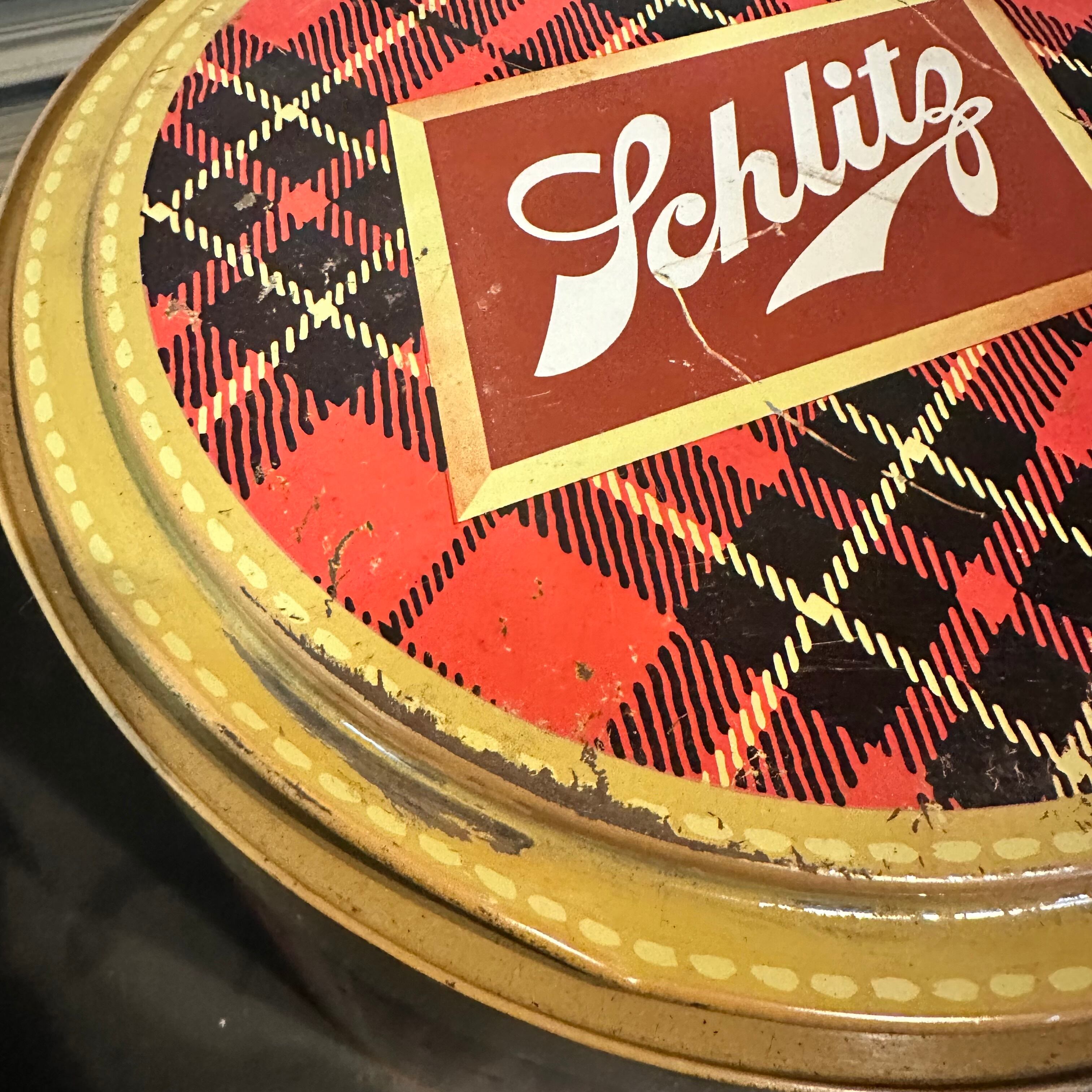 1950年代のSchlitz(シュリッツ)のロゴが入った円形クーラーボックスです。かなり古いアイテムですので基本的にはディスプレイ用や収納品としてご活用いただくと良いかと思います。何と言っても全体のカラーリングが可愛く、飾っているだけでアメリカンな雰囲気が楽しめます。
