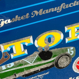 「The World's Largest Gasket Manufacturer(世界最大のガスケットメーカー)」の文字と、クラシックカー、ガスケットのイラストがレトロでクールなデザインです。