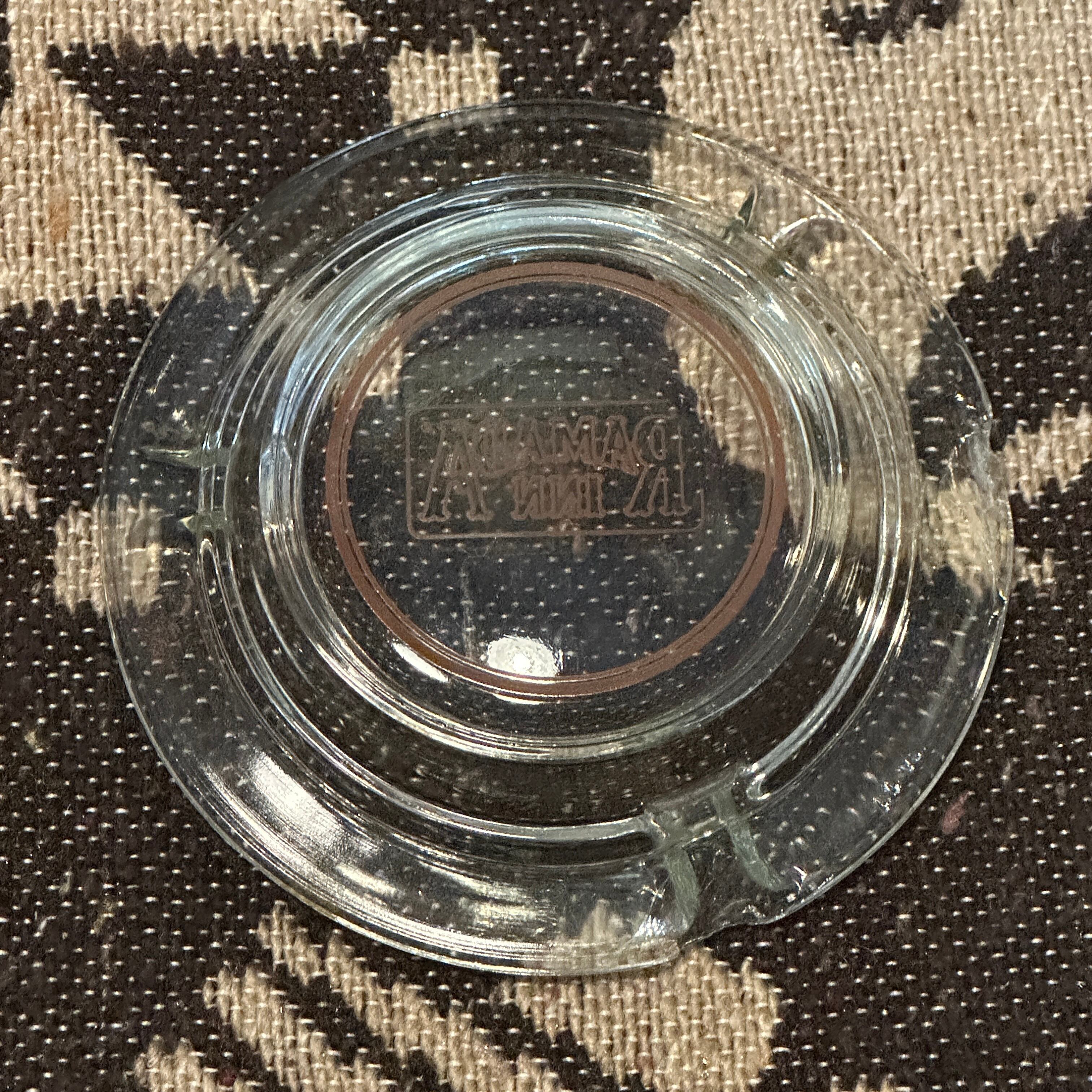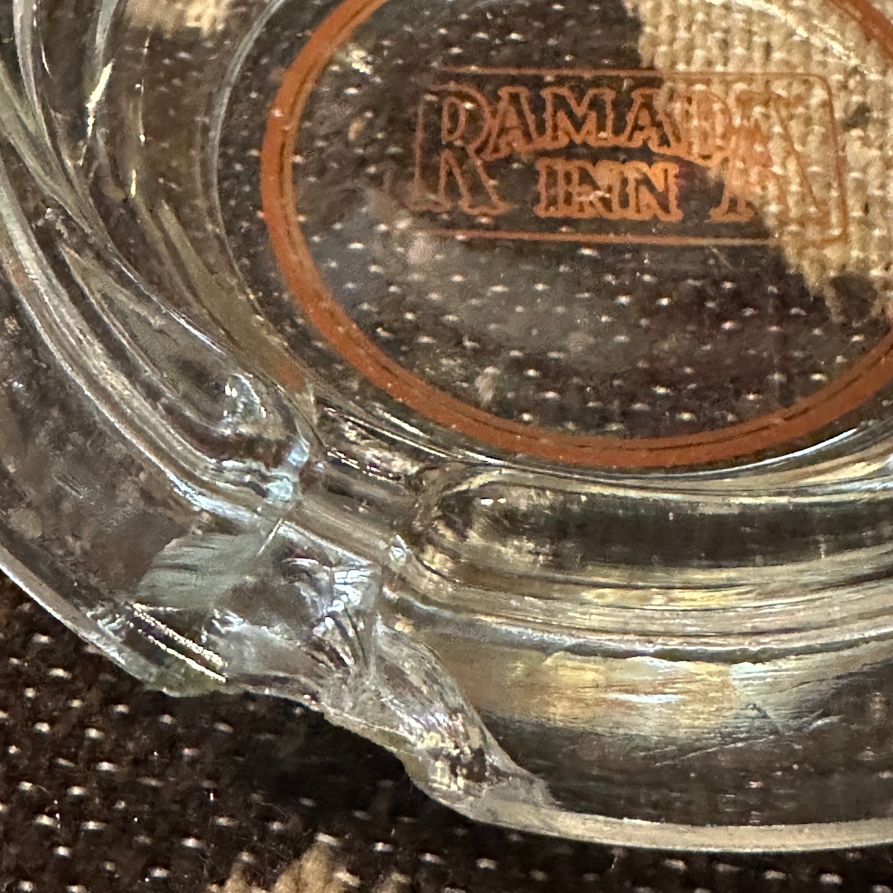 ■デザイン:中心には、かつての象徴的なロゴ「RAMADA INN」の文字が茶色でデザインされています。厚みと重みのあるクリアガラス製で、しっかりとした作りです。円形で扱いやすい形状です。