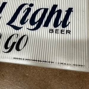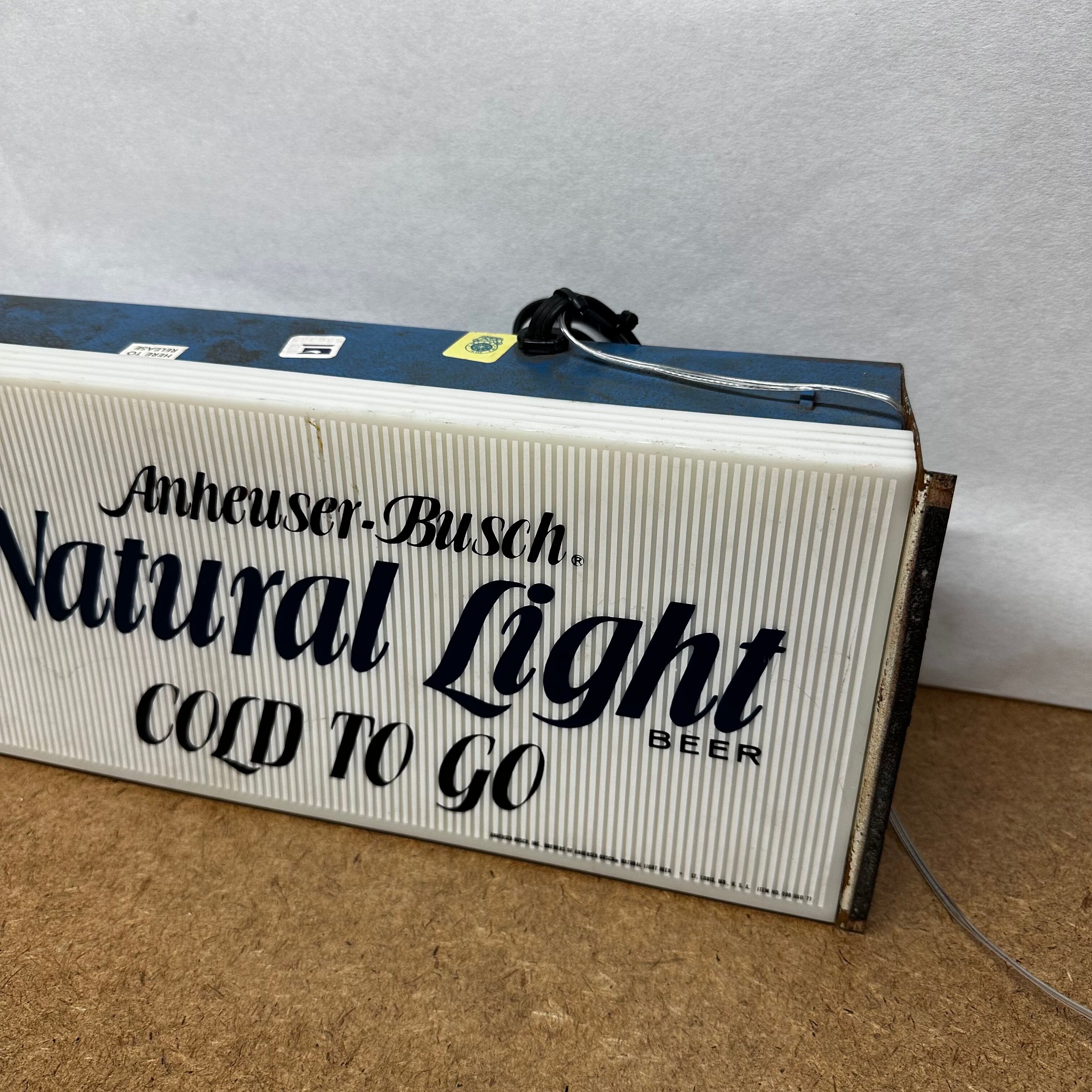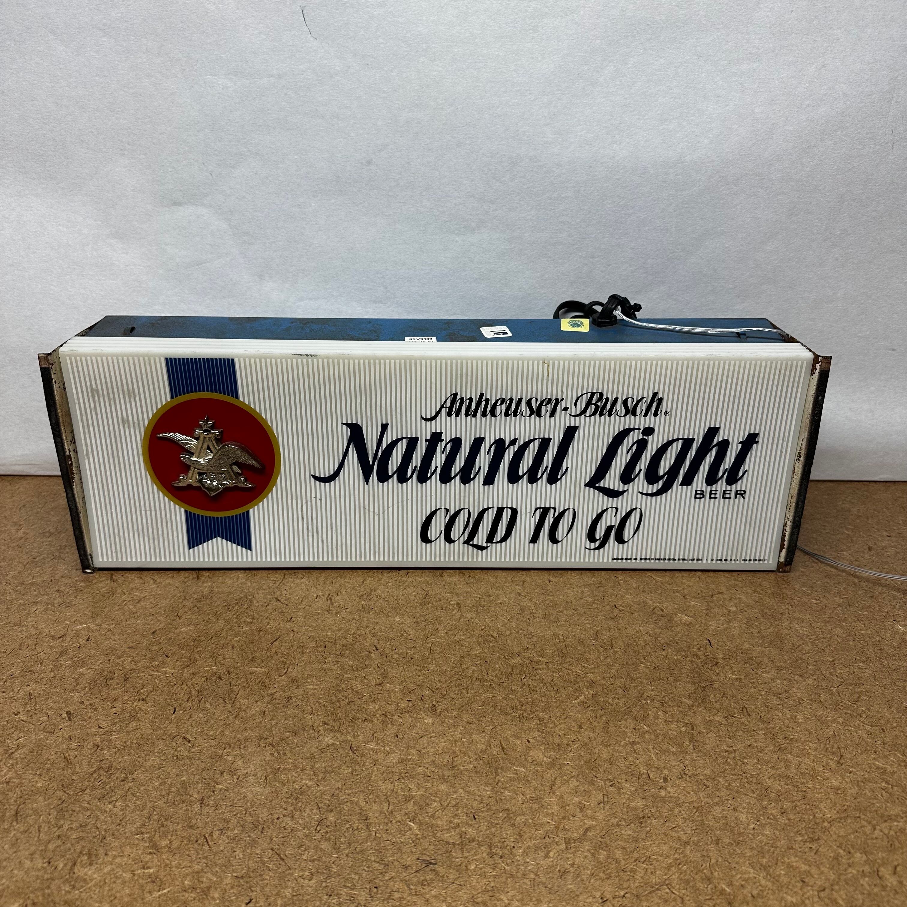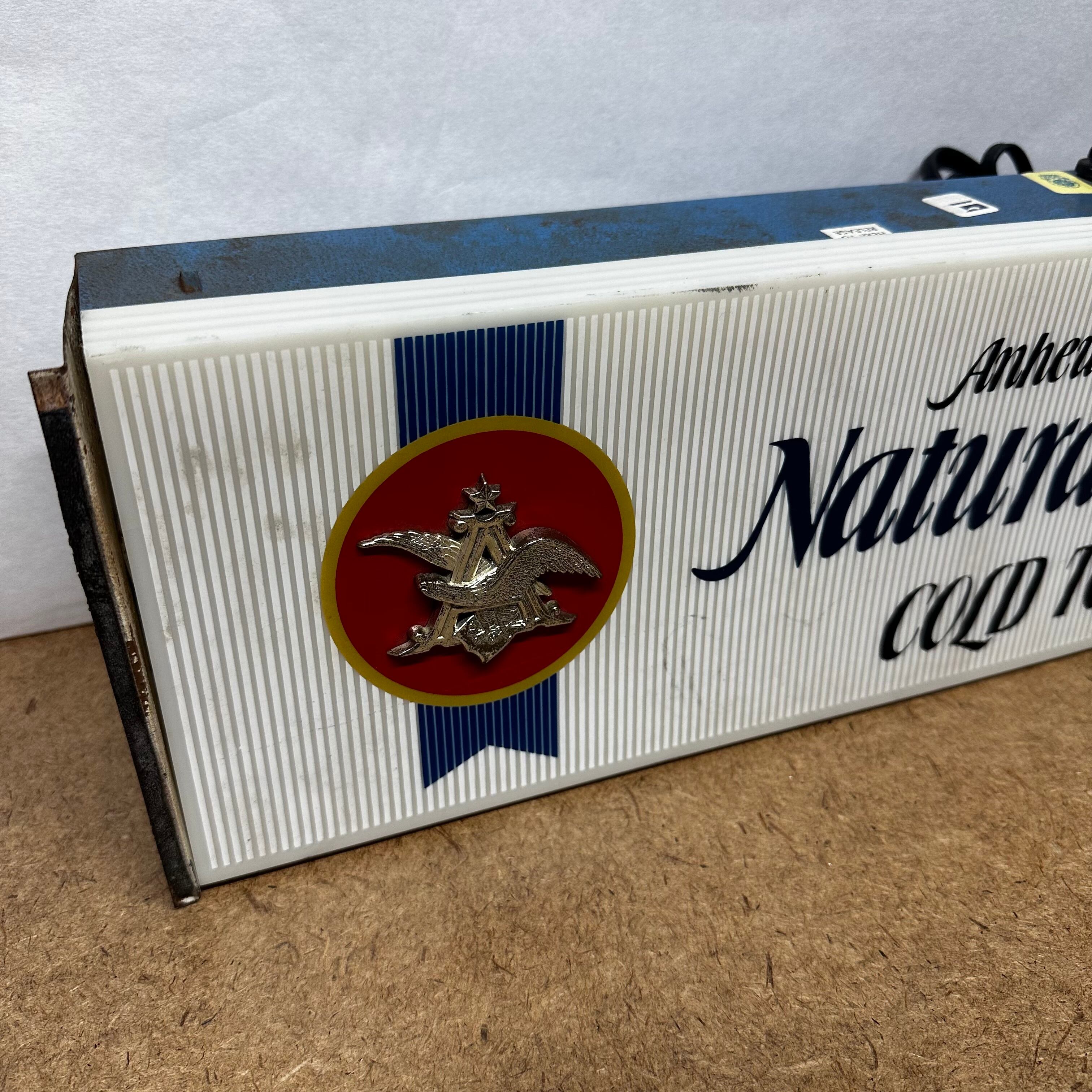 アメリカの大手ビールメーカー Anheuser‑Busch(アンハイザー・ブッシュ) の人気ブランド「Natural Light」の電飾サインパネルです。 “COLD TO GO” のキャッチコピー入りで、飲食店のカウンターやガレージ、ホームバーのインテリアにぴったり。ヴィンテージ感のあるデザインが空間をオシャレに演出します。