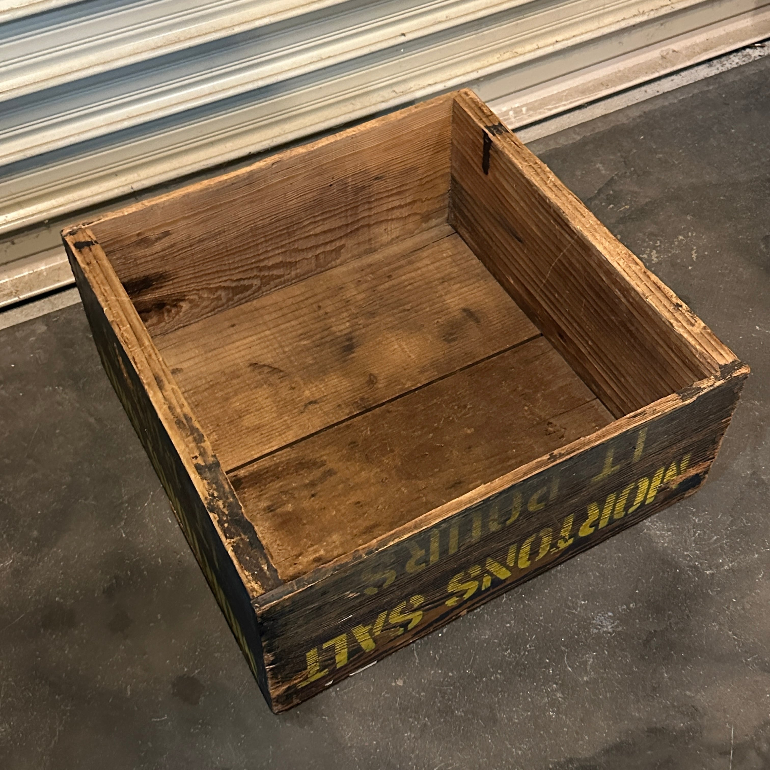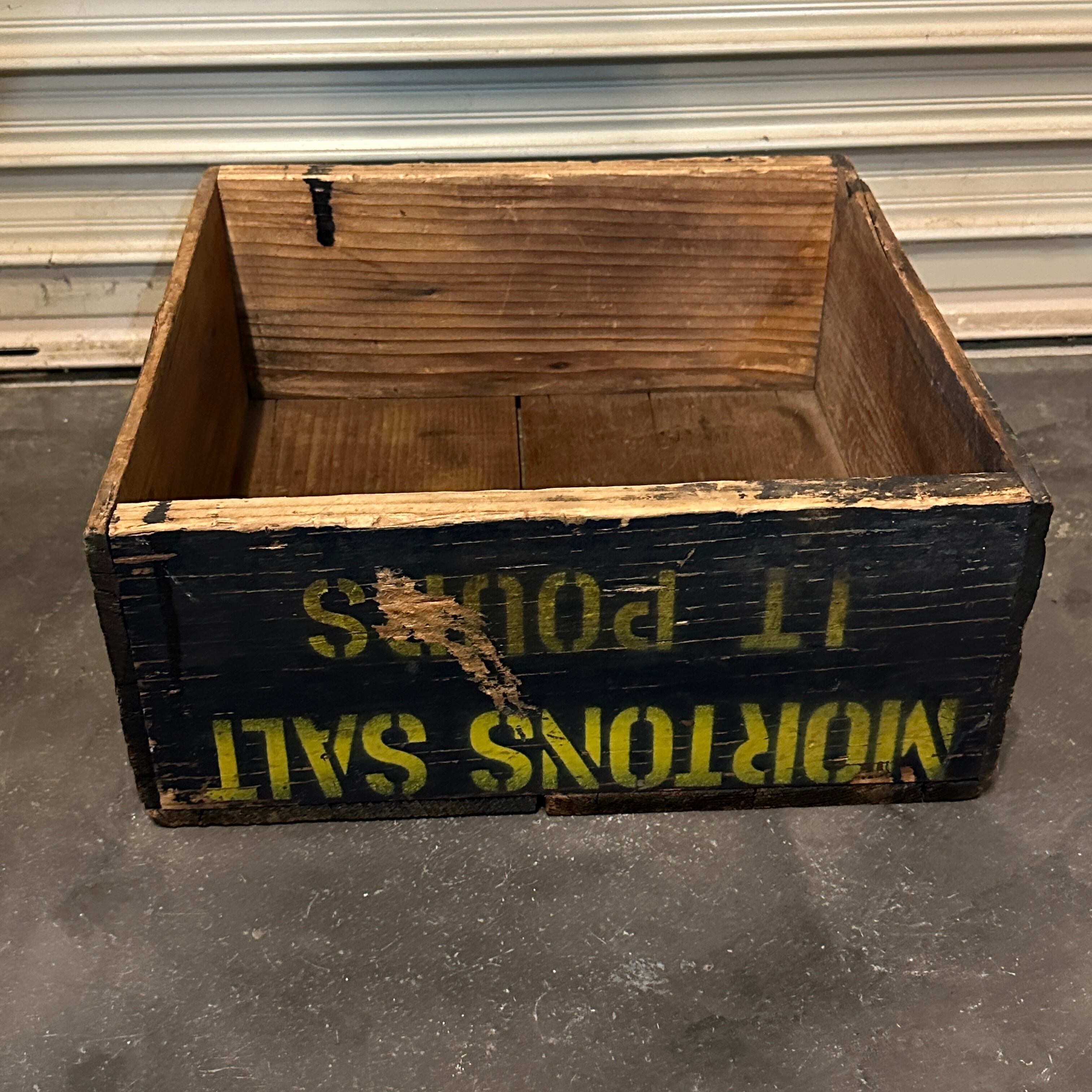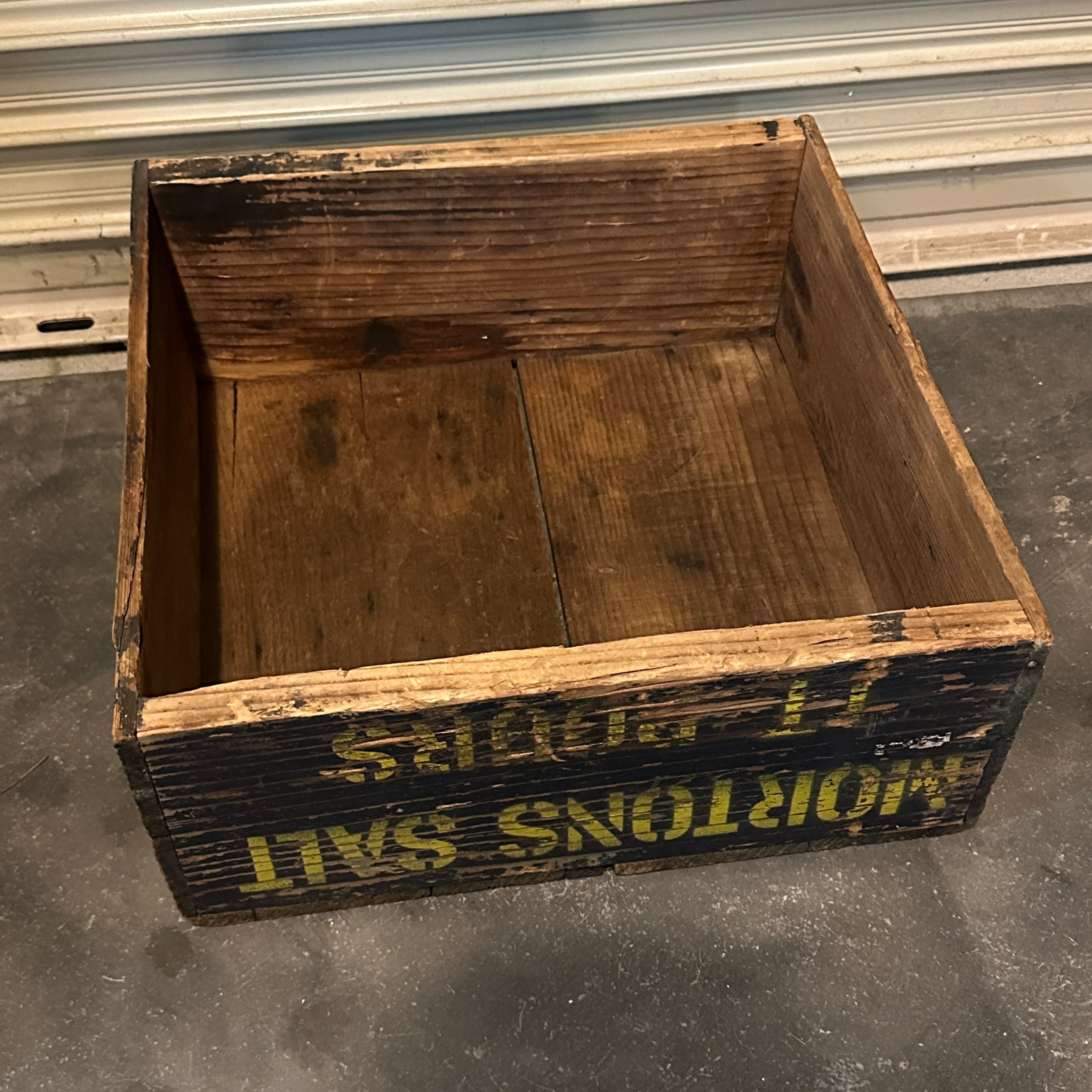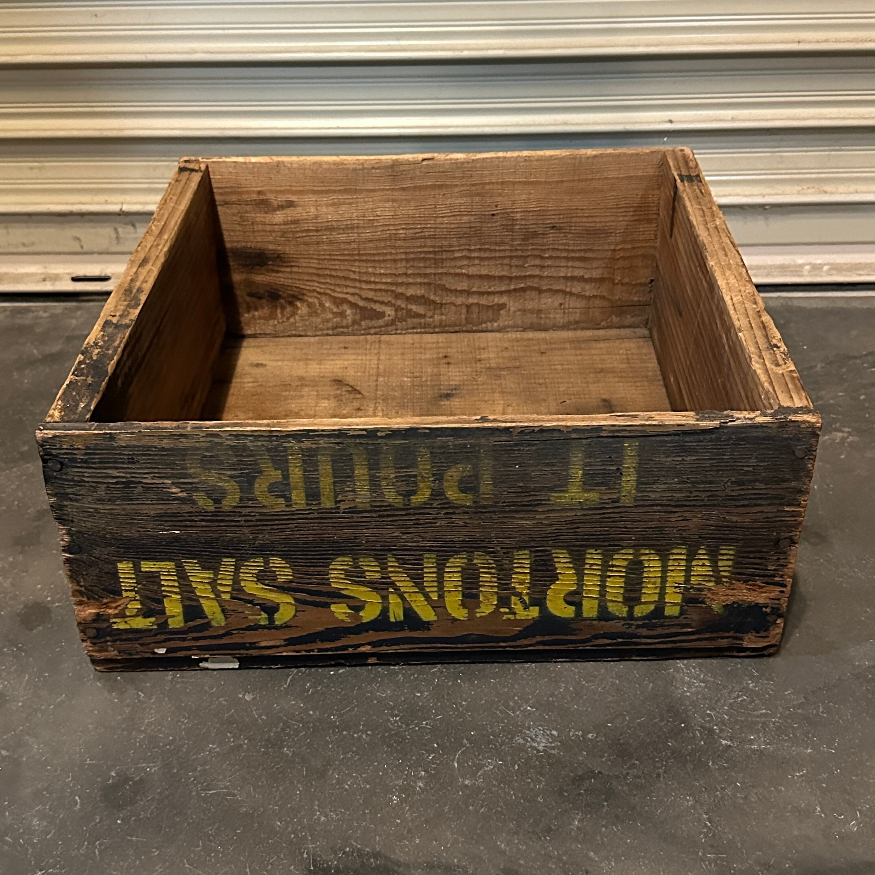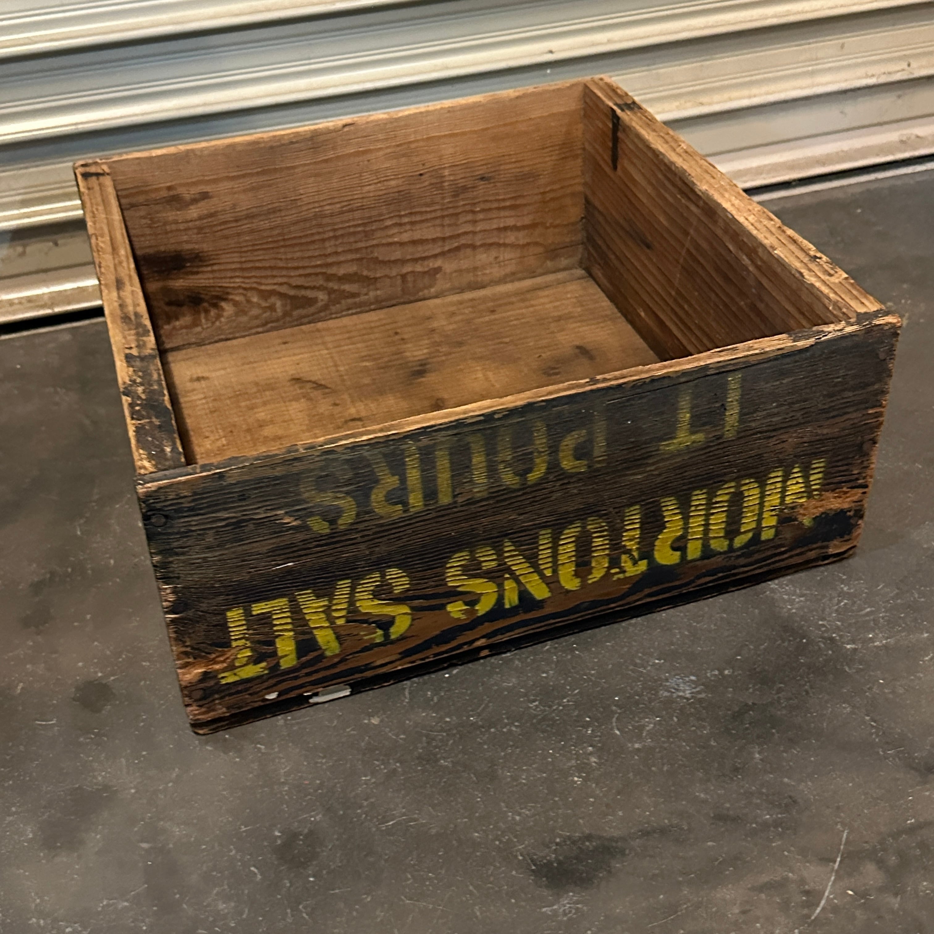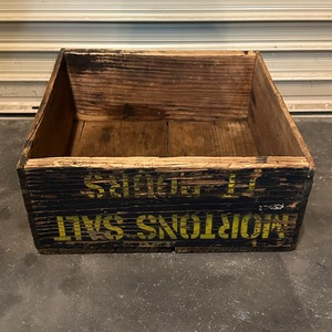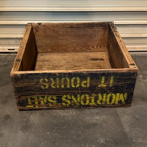 アメリカの老舗塩メーカー「MORTON SALT(モートンソルト)」のロゴが印象的な木箱です。