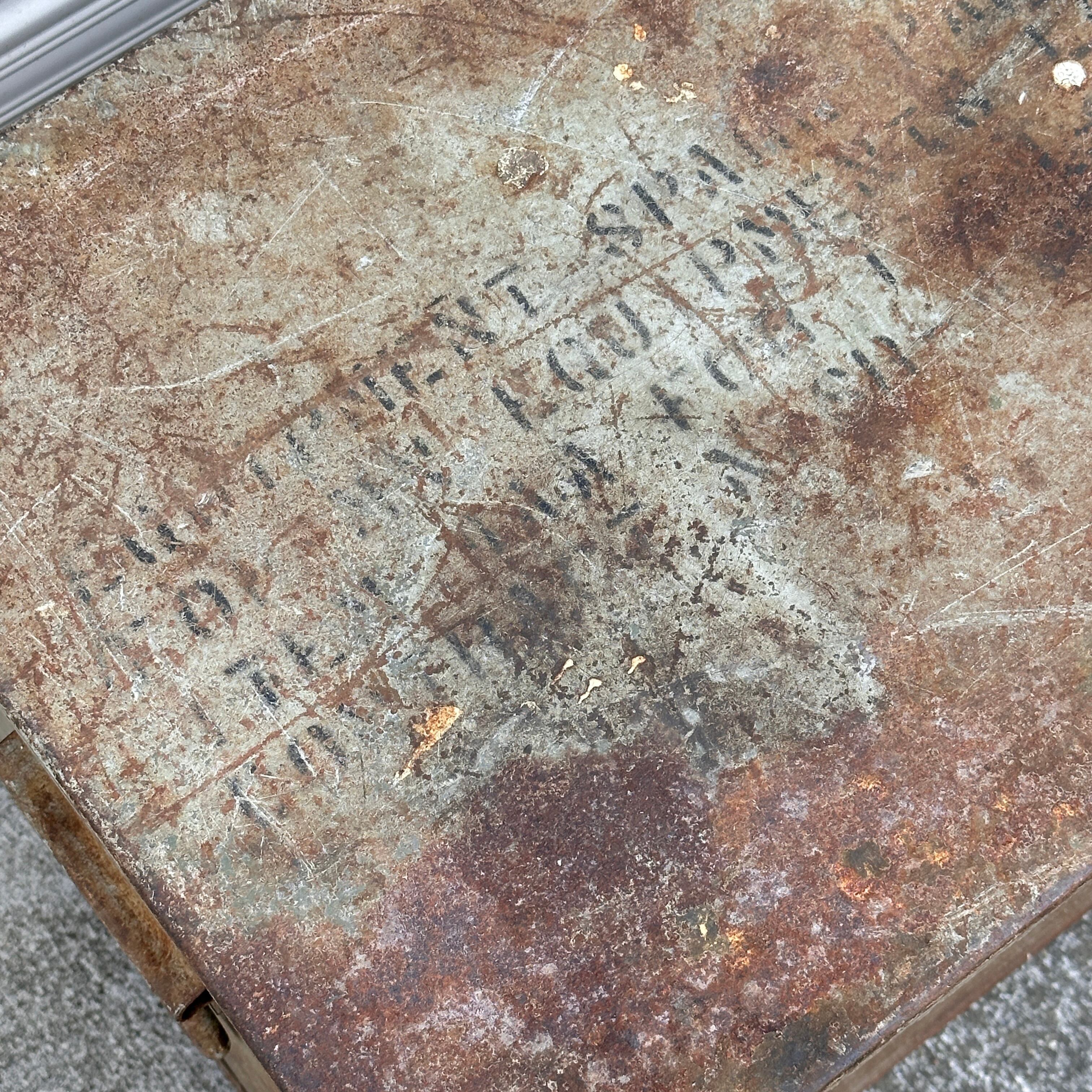 最大の見どころは、蓋の表面に残された当時のステンシル印字(刻印)です。経年によりかすれていますが、ニューヨークの製造メーカー「AIR KING PRODUCTS CO. INC」や、米軍の主要サプライヤーである「HAZELTINE ELECTRONICS CORP」の名称、そして「MODEL BL-6」用の装備品スペアパーツ(EQUIPMENT SPARE PARTS)であったことが確認できます。ニューヨーク州ブルックリンで製造され、実際に戦地や基地で任務を支えてきた「歴史の証人」とも言える貴重な一点物です。
