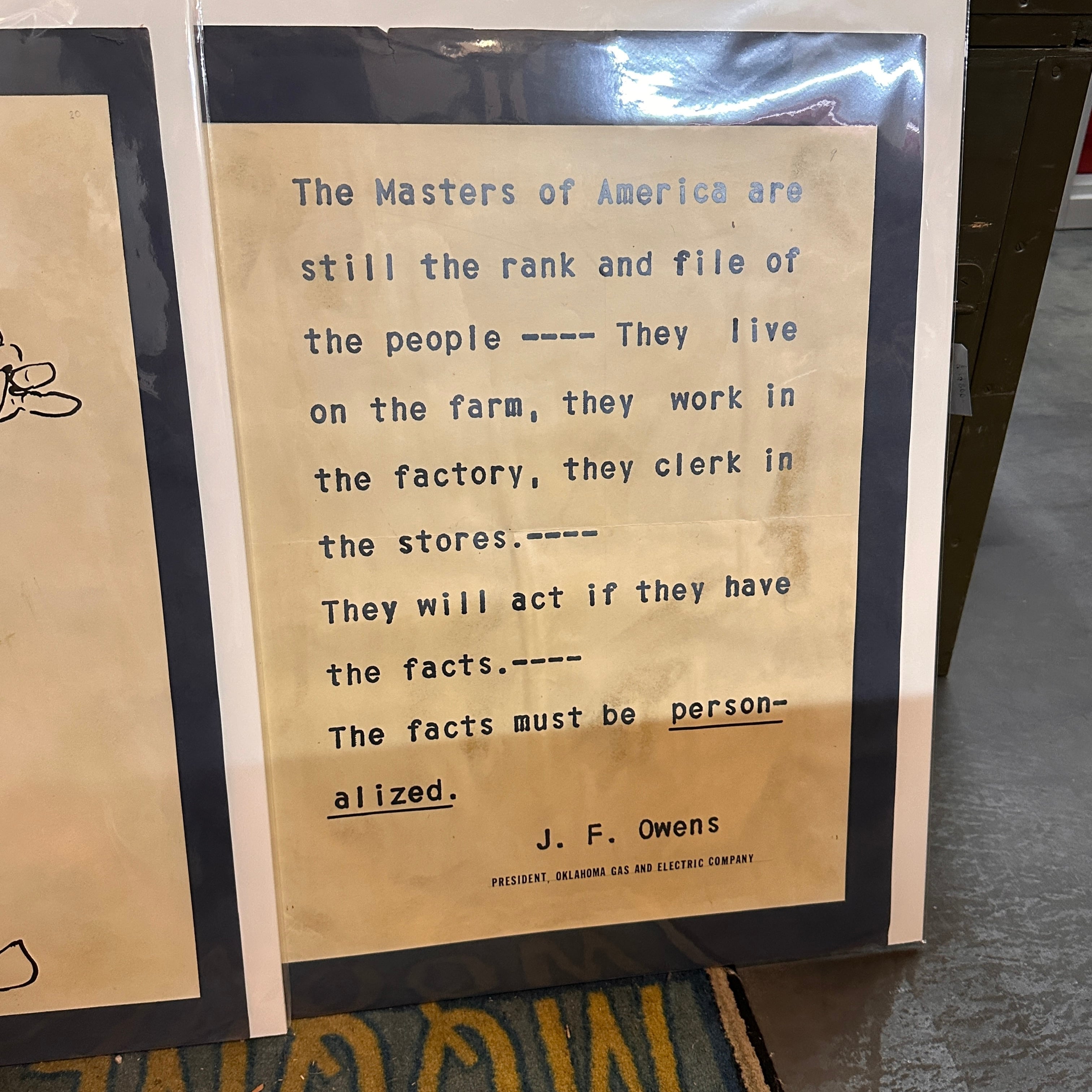 右側のポスターには、当時のOklahoma Gas and Electric Company(OG&E)社長、J. F. Owens氏の名言が記されています。